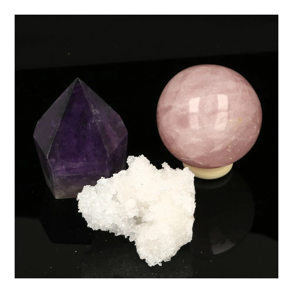 De ruwe bergkristal met zeer fijne kristallen uit Marokko is ongeveer 5 x 4cm en 3,5cm hoog. De donkerpaarse amethist gepolijste punt uit Brazilië is circa 5cm hoog, 3,8cm breed en 3,7cm diep. De gepolijste rozenkwarts bol uit Madagaskar heeft een diameter van circa 4,7cm en je ontvangt deze met een houten ring. Je ontvangt de gouden driehoek set van de foto.