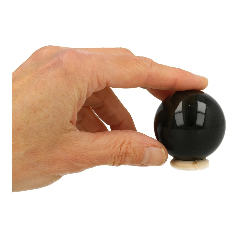 Mooie zwarte goudglans obsidiaan bol met een diameter van 44mm. In het licht komt de zilver-gouden glans van de obsidiaan bol goed naar voren, in de schaduw lijkt deze bol bijna zwart. Je ontvangt de goudglans obsidiaan bol van de foto met houten ring.