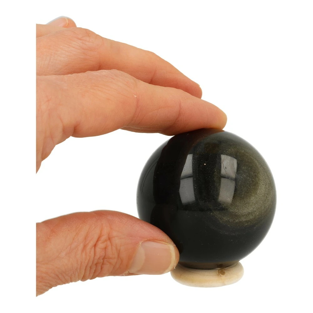 Mooie zwarte goudglans obsidiaan bol met een diameter van circa 46mm. In het licht komt de gouden glans van de obsidiaan bol goed naar voren, in de schaduw lijkt deze bol bijna zwart. Je ontvangt de goudglans obsidiaan bol van de foto met houten ring.
