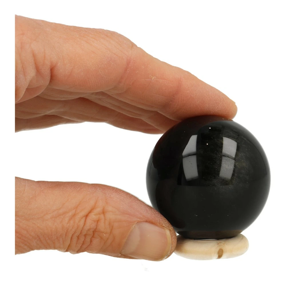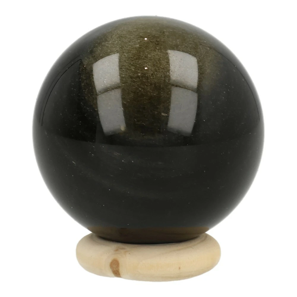 Mooie zwarte goudglans obsidiaan bol met een diameter van ongeveer 4cm (38-39mm). In het licht komt de zilver-gouden glans van de obsidiaan bol goed naar voren, in de schaduw lijkt deze bol bijna zwart. Je ontvangt een soortgelijke goudglans obsidiaan bol als op de foto’s met houten ring. De kwaliteit is zeer gelijkwaardig.