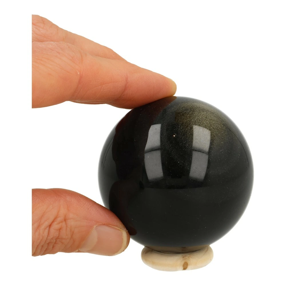 Mooie zwarte goudglans obsidiaan bol met een diameter van circa 52mm. In het licht komt de gouden glans van de obsidiaan bol goed naar voren, in de schaduw lijkt deze bol bijna zwart. Je ontvangt de goudglans obsidiaan bol van de foto met houten ring.
