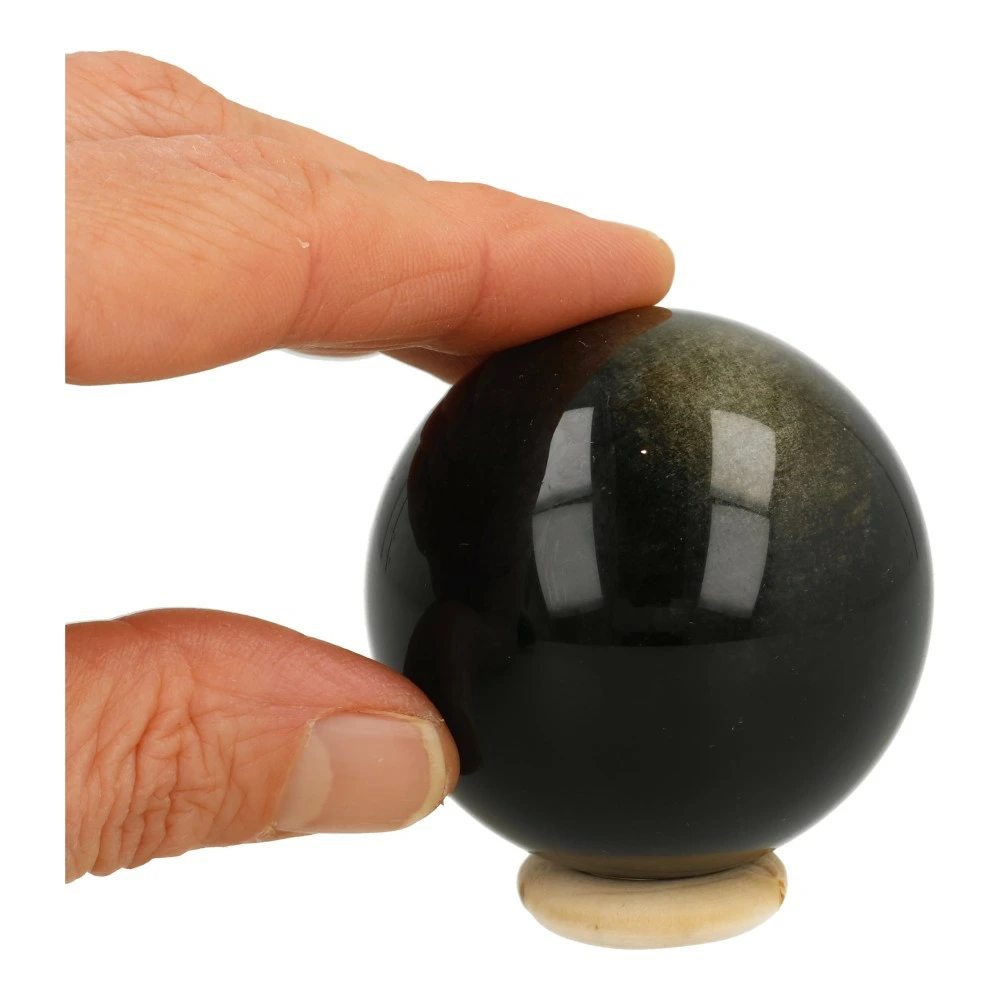 Mooie zwarte goudglans obsidiaan bol met een diameter van 55mm ‘nr2’. In het licht komt de gouden glans van de obsidiaan bol goed naar voren, in de schaduw lijkt deze bol bijna zwart. Je ontvangt de goudglans obsidiaan bol van de foto met houten ring.