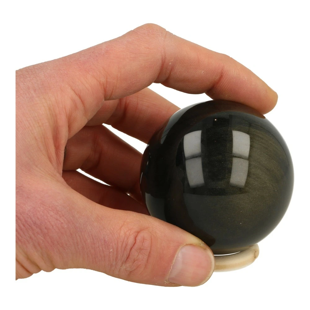 Mooie zwarte met zilver en goudglans obsidiaan bol met een diameter van 61mm. In het licht komt de zilver-gouden glans van de obsidiaan bol goed naar voren, in de schaduw lijkt deze bol bijna zwart. Je ontvangt de goudglans obsidiaan bol van de foto met houten ring.
