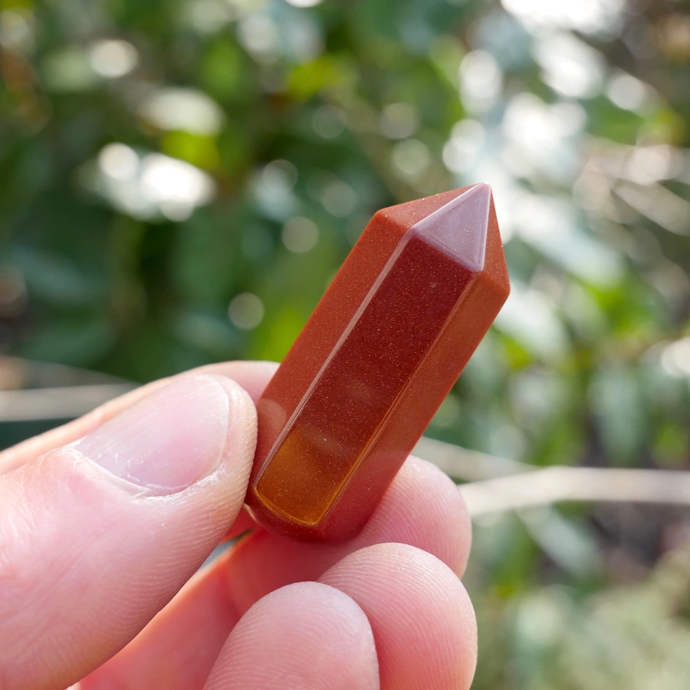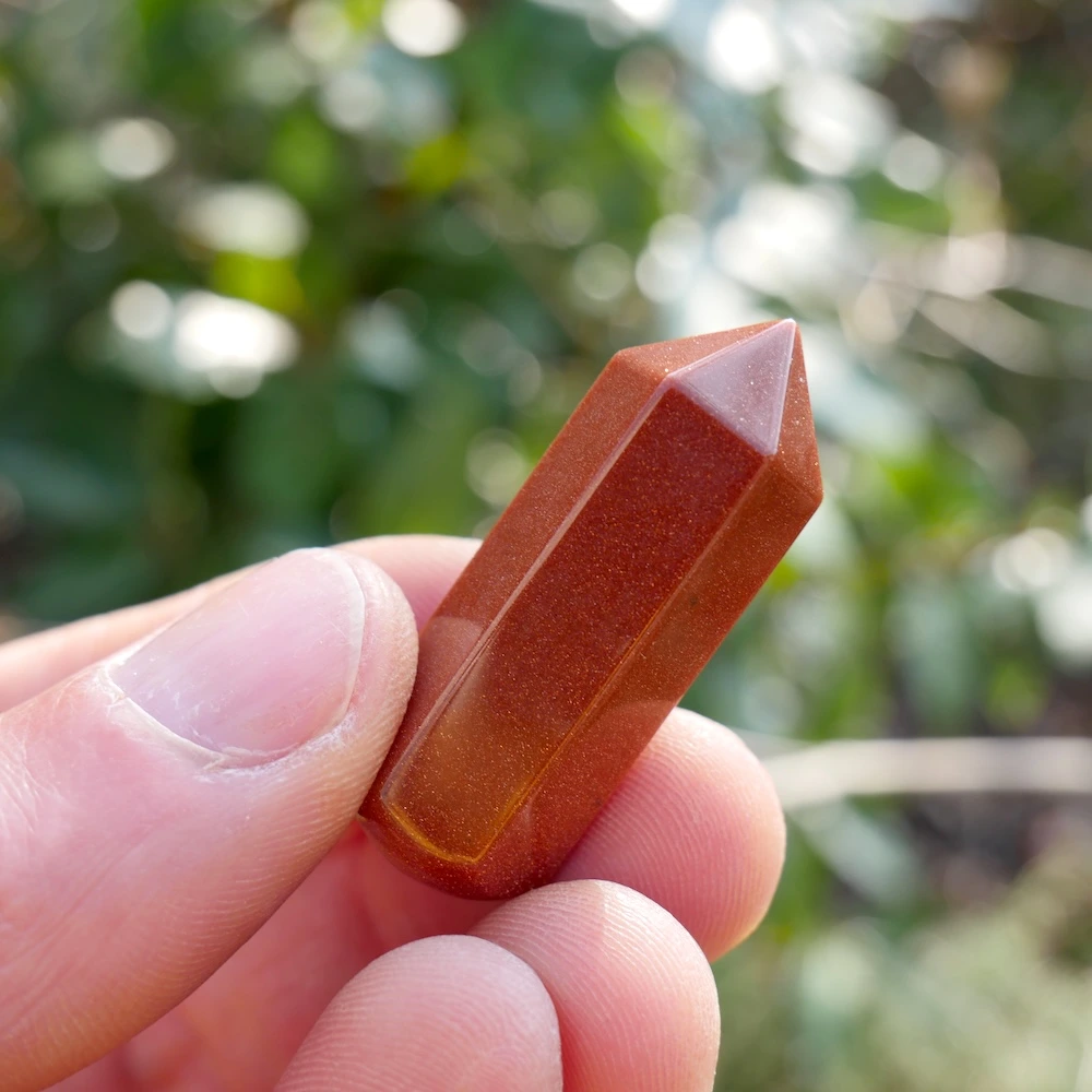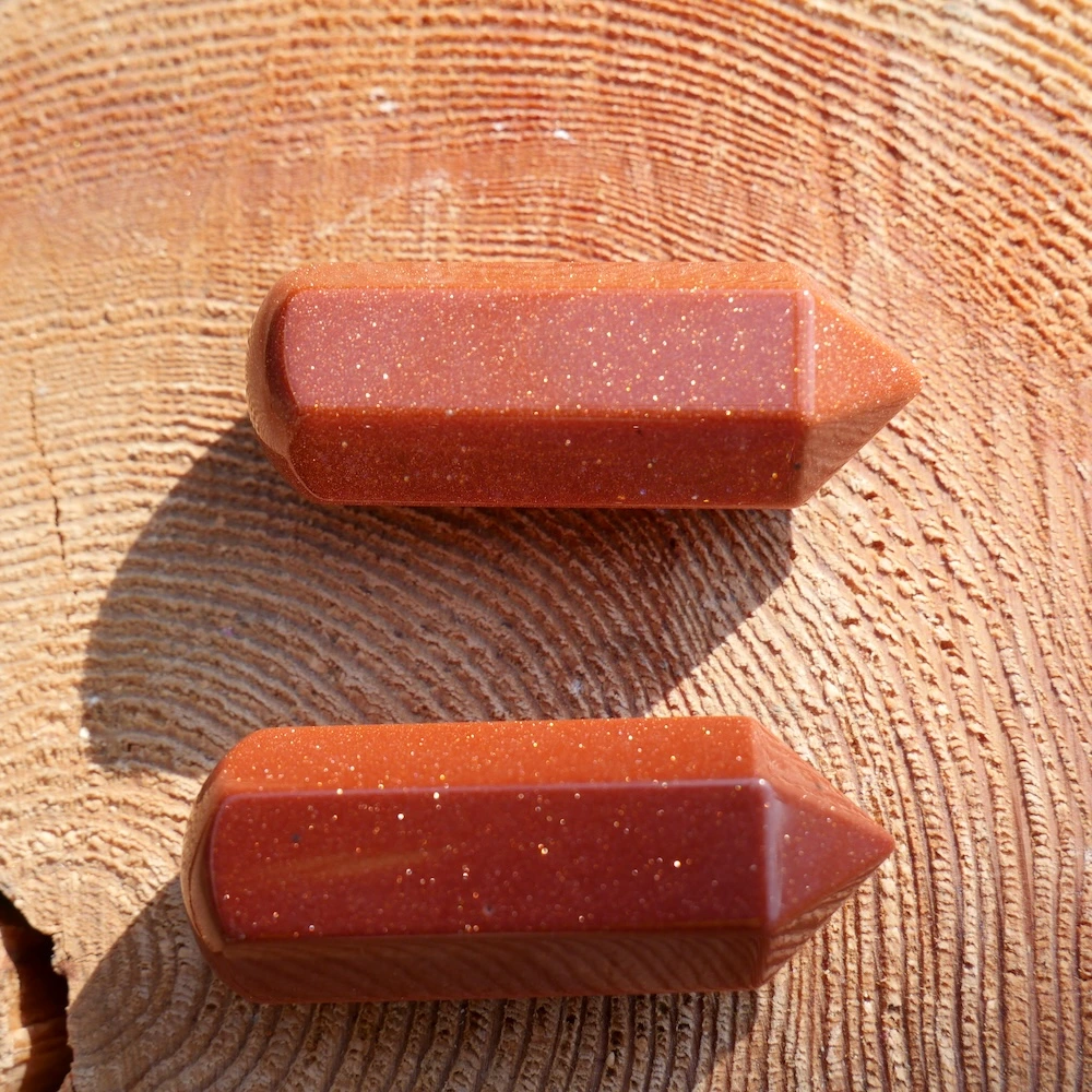 Goudsteen massagesteen van circa 5cm lang en 2cm hoog en diep. Deze zeshoekige massagestaaf heeft een bolle onderkant en spitse punt, zodat je zowel de spieren kunt masseren als meridiaanpunten kunt stimuleren. Je ontvangt een soortgelijke goudsteen massagestaaf als op de foto. Goudsteen is fraai, door mensen gemaakt materiaal met schittering van stukjes koper en is geen natuurlijke edelsteen.