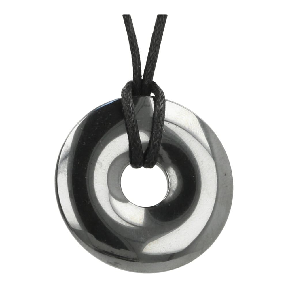 Glimmende grijs-metalen hematiet donut hanger met een diameter van 3cm. Je ontvangt een soortgelijke hematiet donut hanger als op de foto, we zoeken de beste voor je uit bij je bestelling. Je ontvangt de hanger aan een zwart waxkoord.