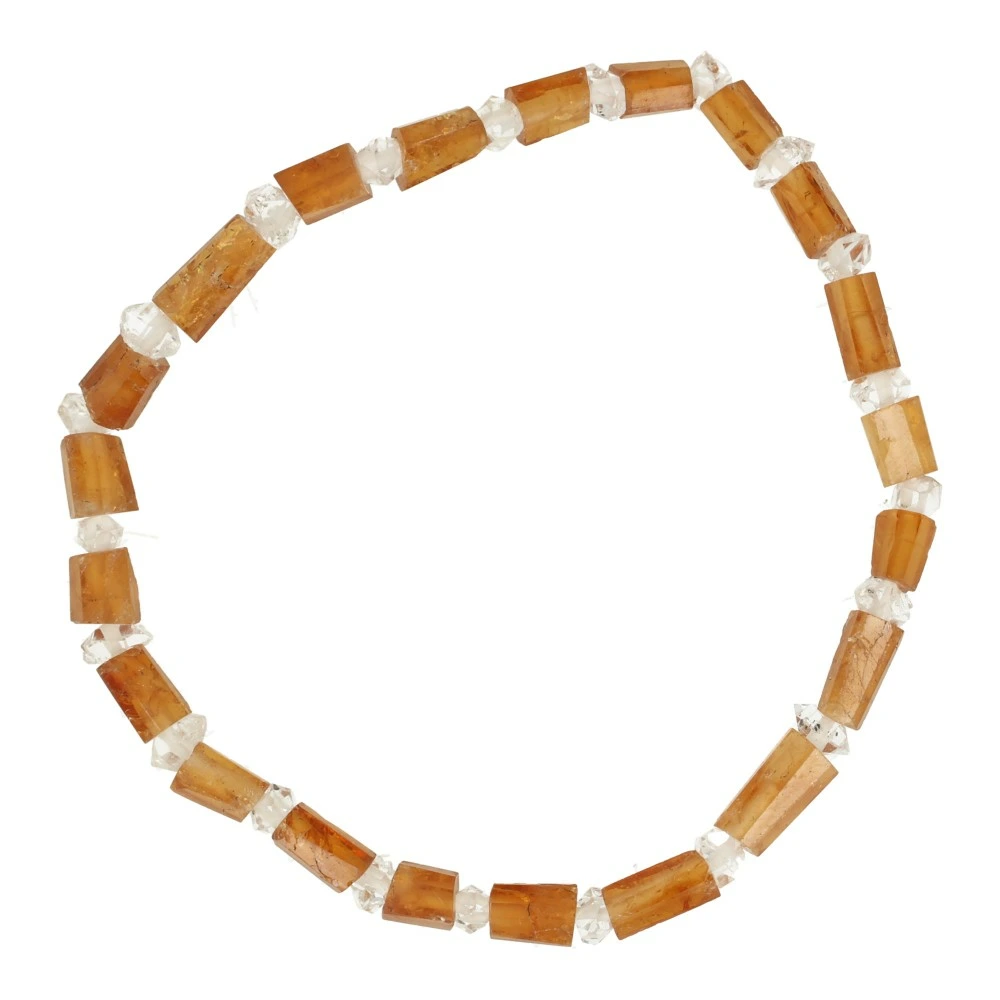 Mooie geslepen oranjebruine hessoniet gecombineerd met heldere Pakistaanse ‘Herkimer diamonds’ op rekbaar koord (nr.2). De warme, aardse tinten van de hessoniet vormen een prachtige balans met de sprankelende helderheid van de Herkimer diamonds.