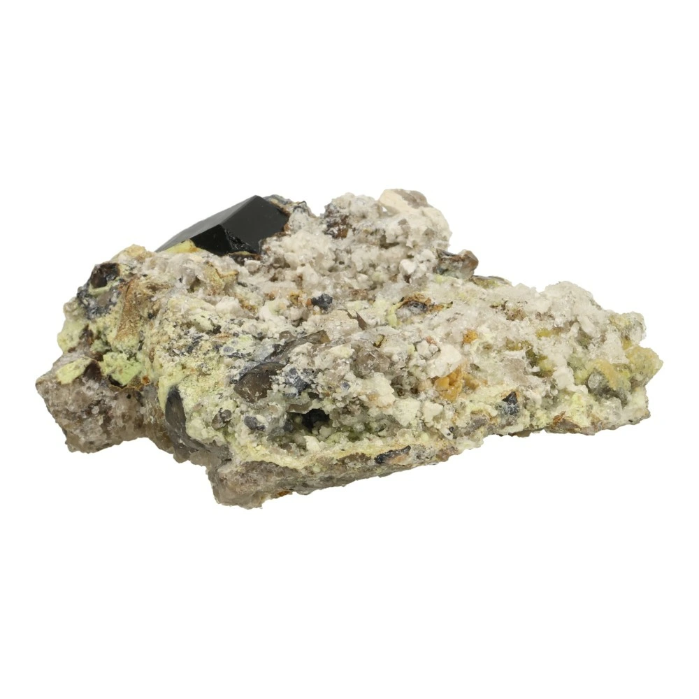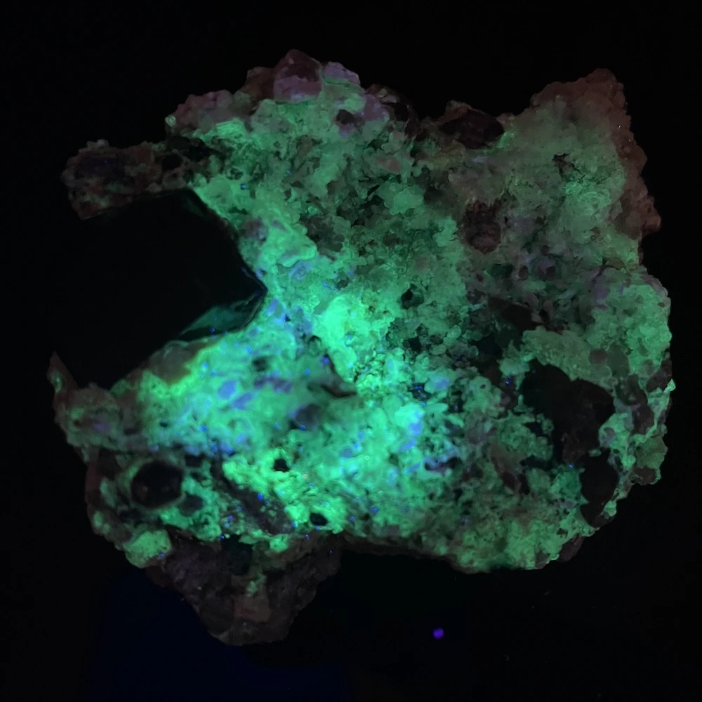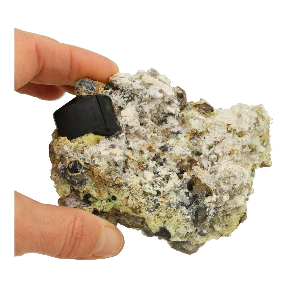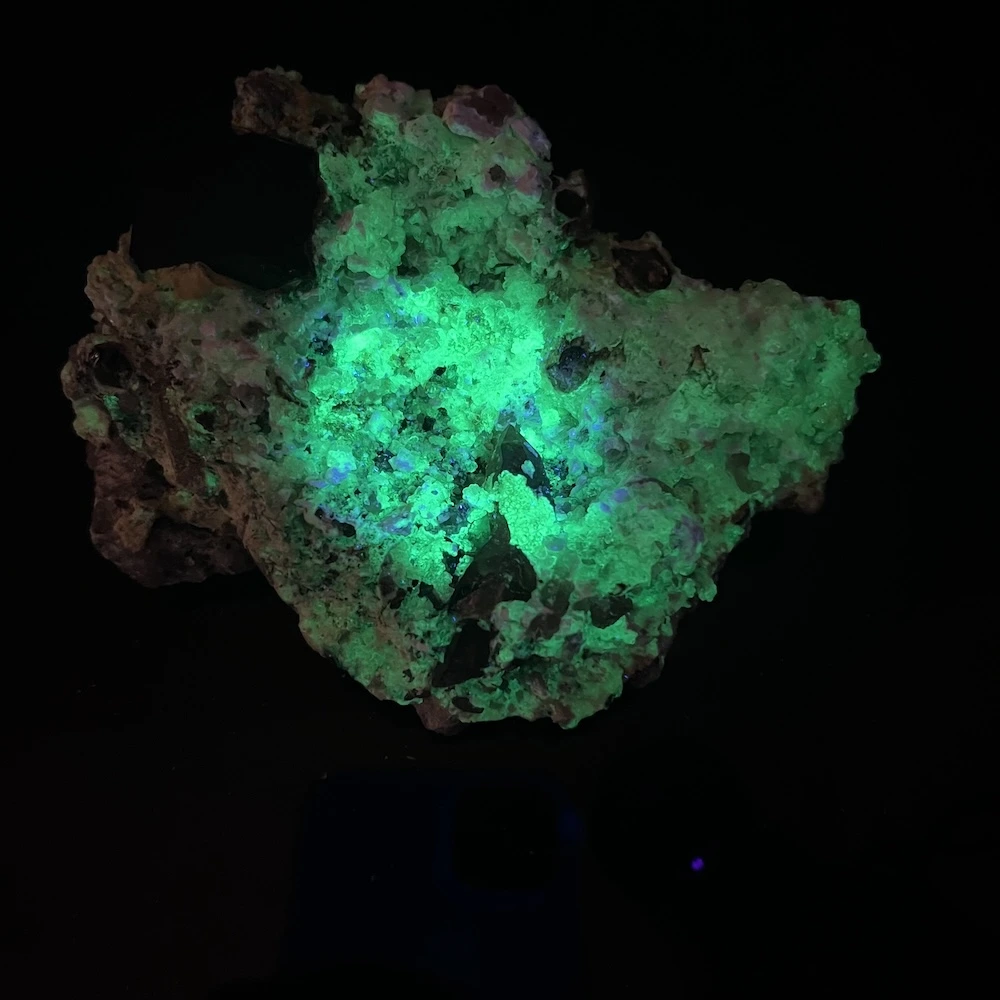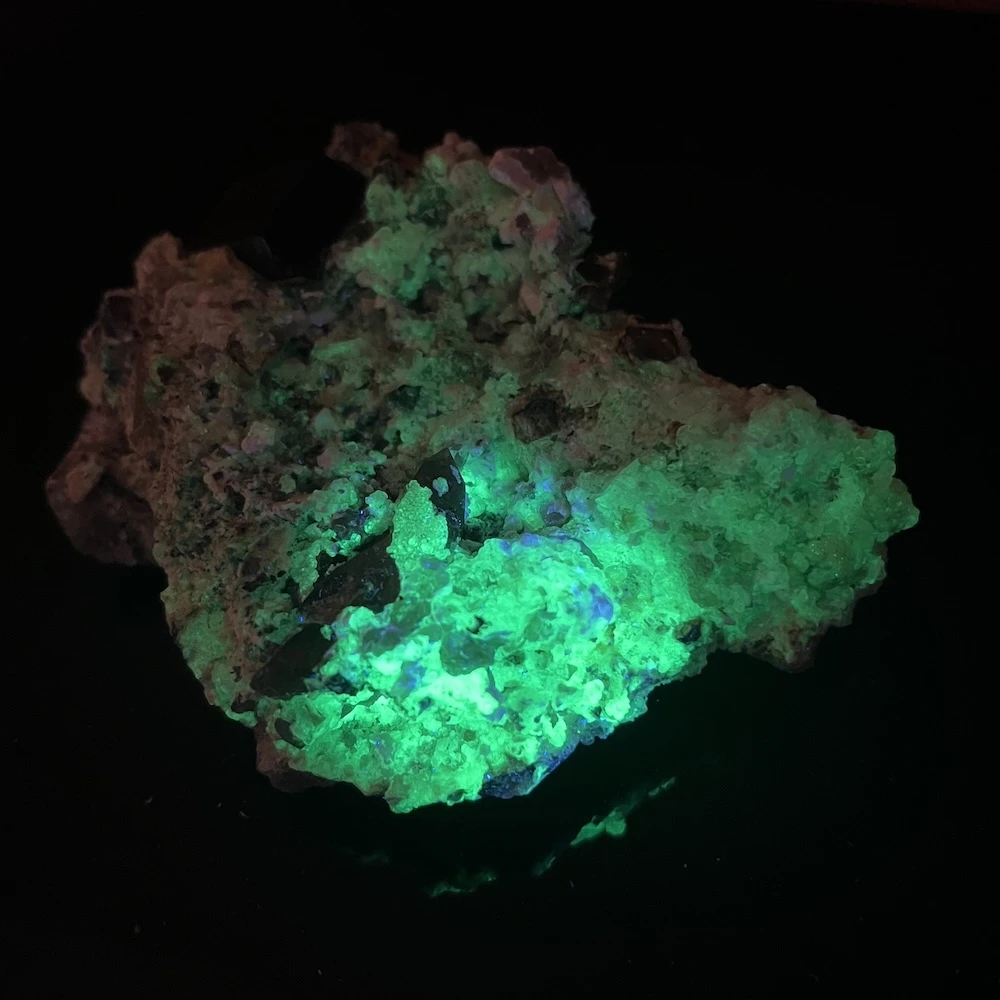 Bijzonder stukje vol met hyaliet opaal, fraaie zwarte toermalijn en rookkwarts. De onderzijde is bedekt met rookkwarts, de bovenzijde met zwarte toermalijn en hyaliet opaal. De hyaliet opaal licht felgroen op onder lange golf UV-licht, zie ook de foto’s. De afmeting van dit stukje is ongeveer 10,9 x 7,9cm en 3,9cm hoog. Deze hyaliet opaal komt uit Erongo, Namibië. Je ontvangt de hyaliet opaal van de foto.