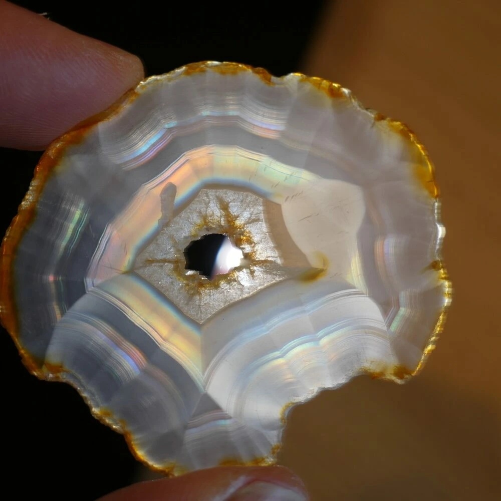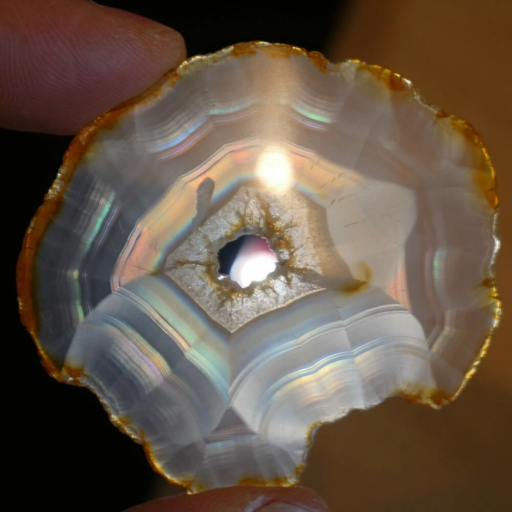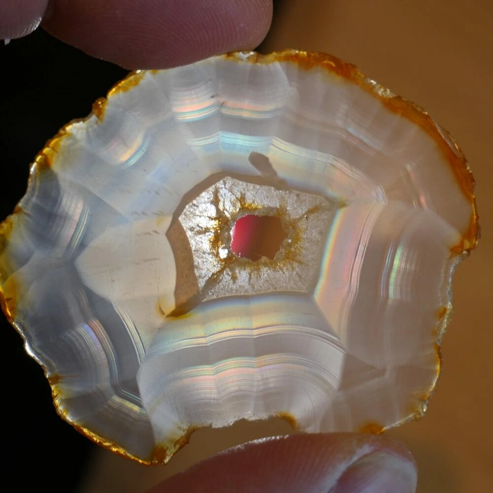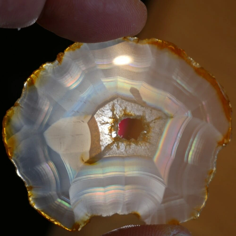 Iris agaat is een zeldzame en bijzondere vorm van agaat die bekend staat om zijn iriserende werking. Wanneer er licht door de steen schijnt, ontstaan er regenboogachtige kleuren. Deze ‘regenboogjes’ zijn het gevolg van extreem fijne, parallelle lagen in de steen die het licht breken. Iris agaat behoort, net als andere agaatsoorten, tot de chalcedoonfamilie en daarmee tot de kwartsgroep, met een hardheid van 7.