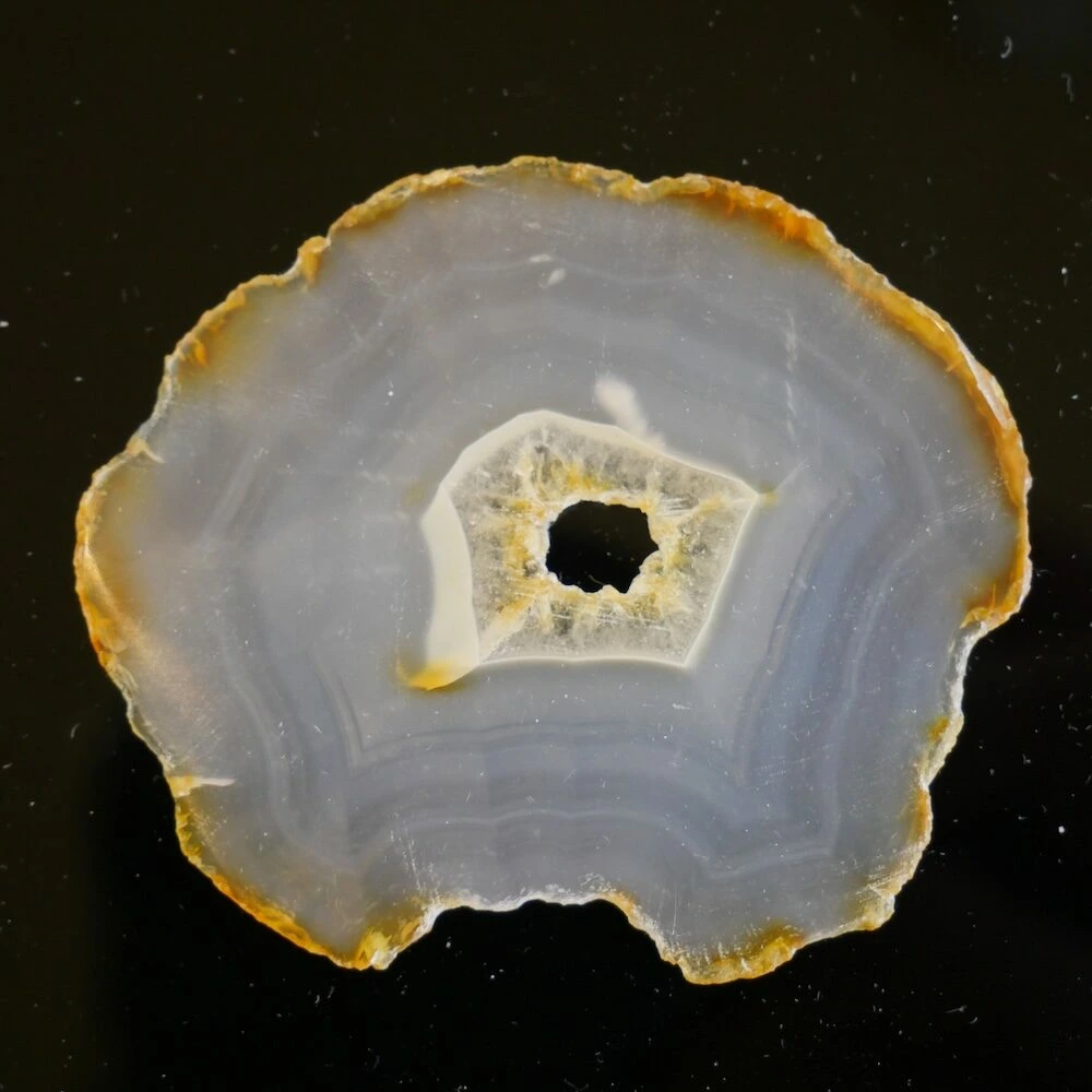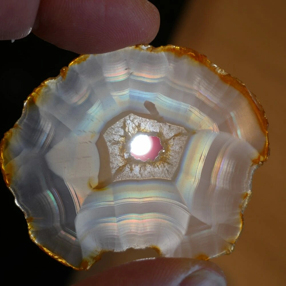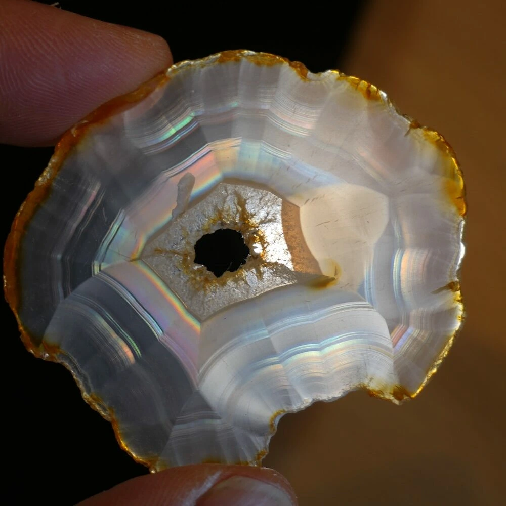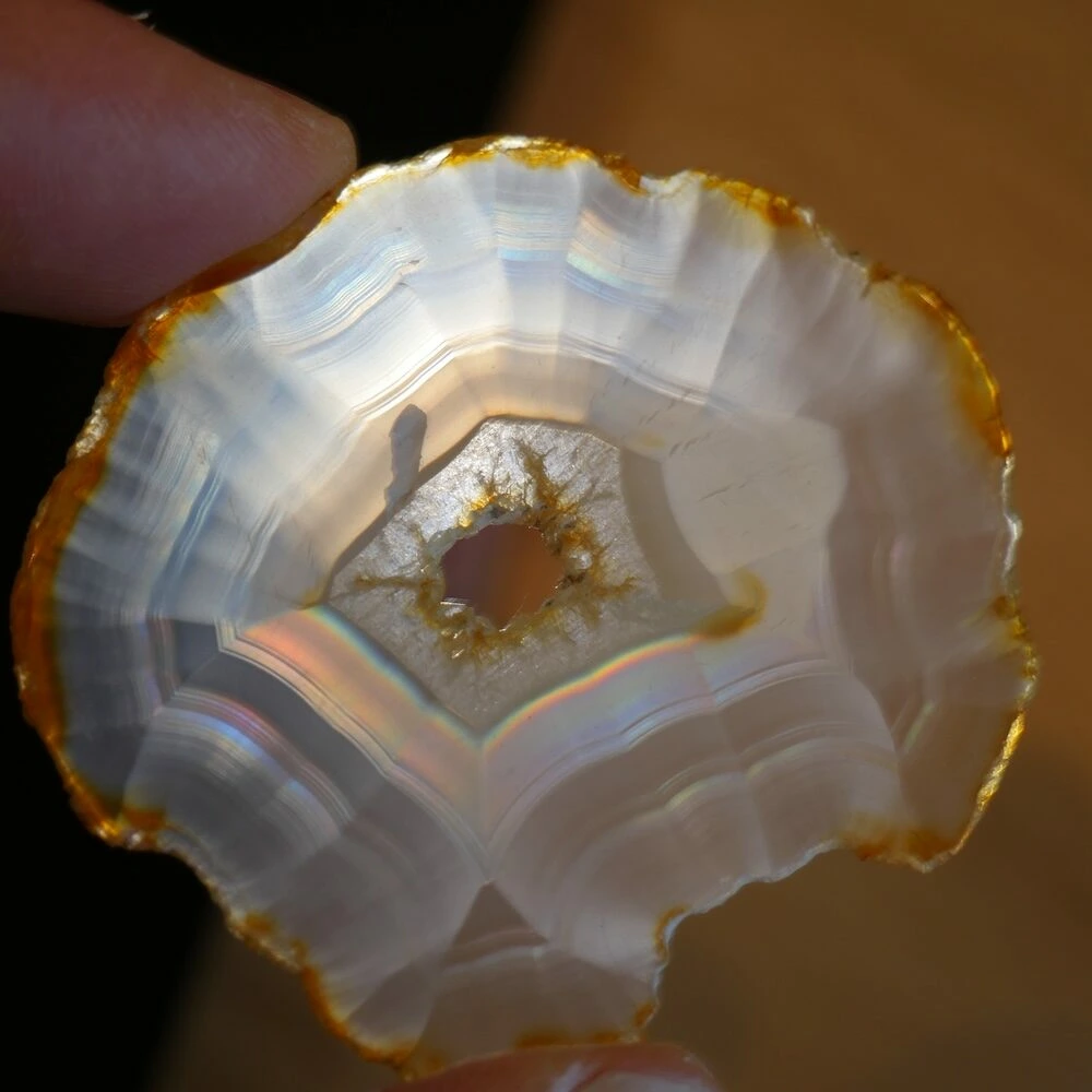 Fraaie iris agaat schijf nr10 met fraaie holte met kristallen in het centrum en veel regenboogjes als je er met een lichtje achter schijnt. Deze zeldzame iriserende agaat schijf komt uit Indonesië en heeft een afmeting van ongeveer 51mm hoog, 58mm breed en 2mm dik. Fraai om recht neer te zetten met een klein lampje er achter. De foto is gemaakt met het lampje van een mobiele telefoon er onder.