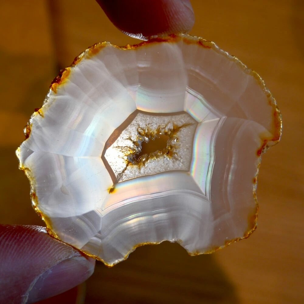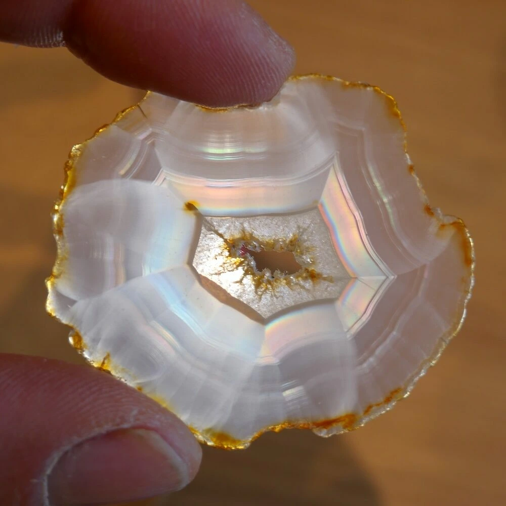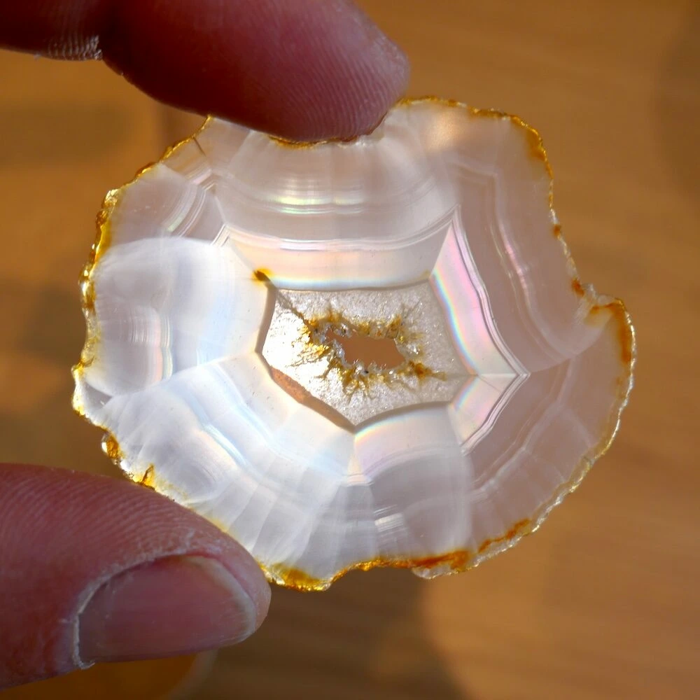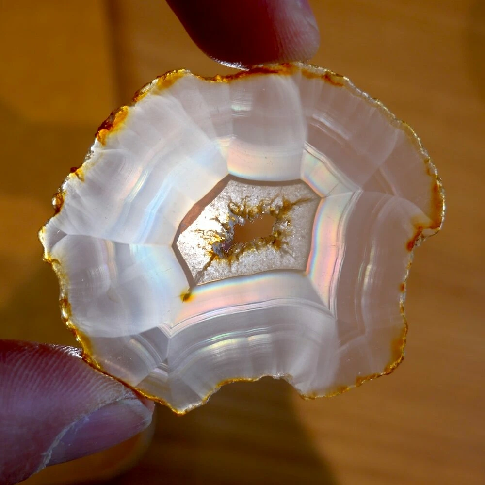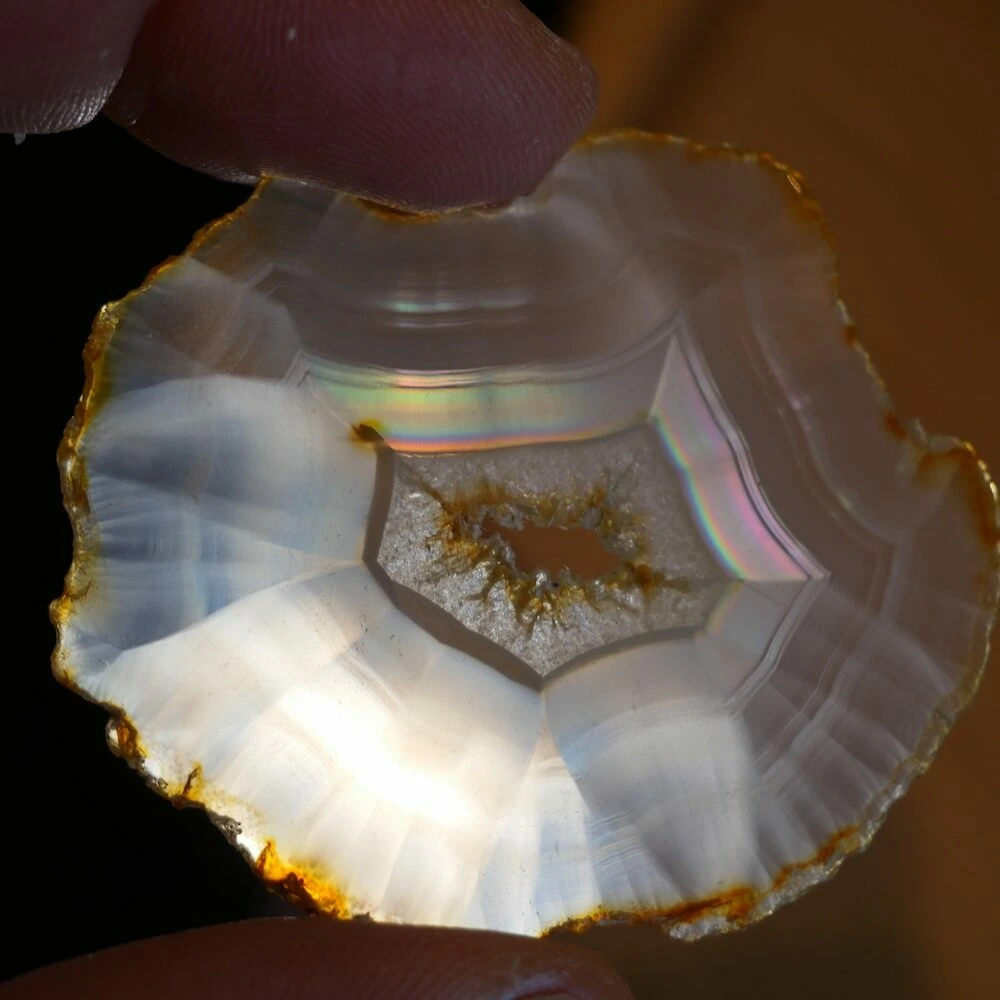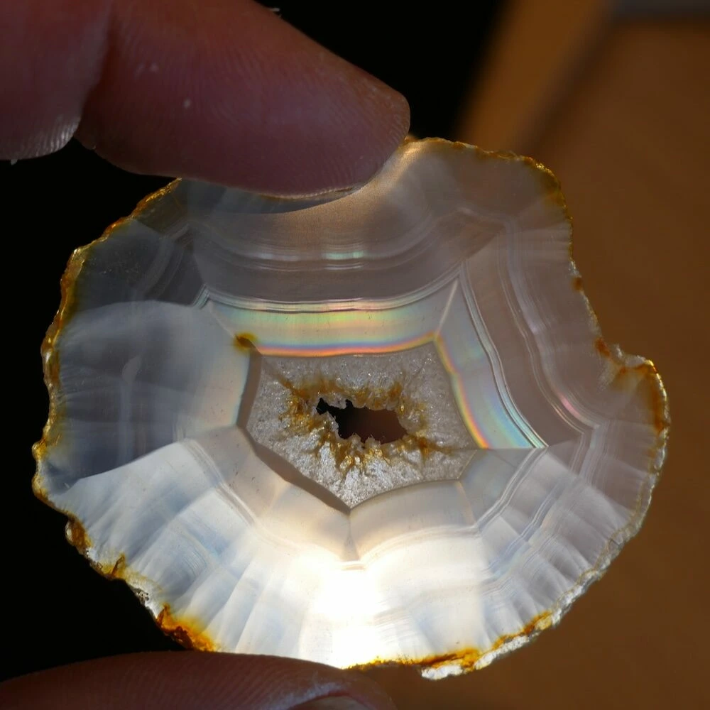 Iris agaat is een zeldzame en bijzondere vorm van agaat die bekend staat om zijn iriserende werking. Wanneer er licht door de steen schijnt, ontstaan er regenboogachtige kleuren. Deze ‘regenboogjes’ zijn het gevolg van extreem fijne, parallelle lagen in de steen die het licht breken. Iris agaat behoort, net als andere agaatsoorten, tot de chalcedoonfamilie en daarmee tot de kwartsgroep, met een hardheid van 7.