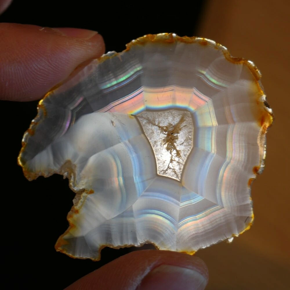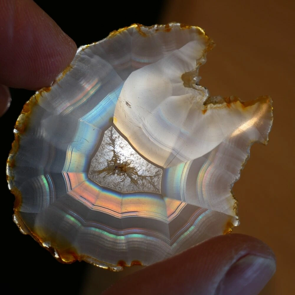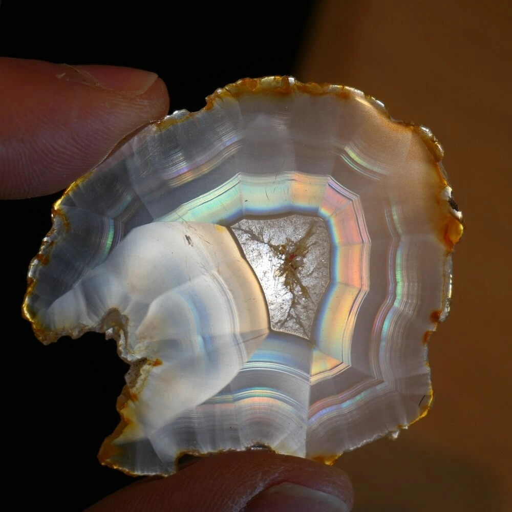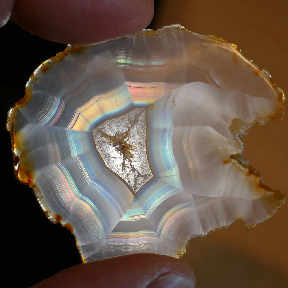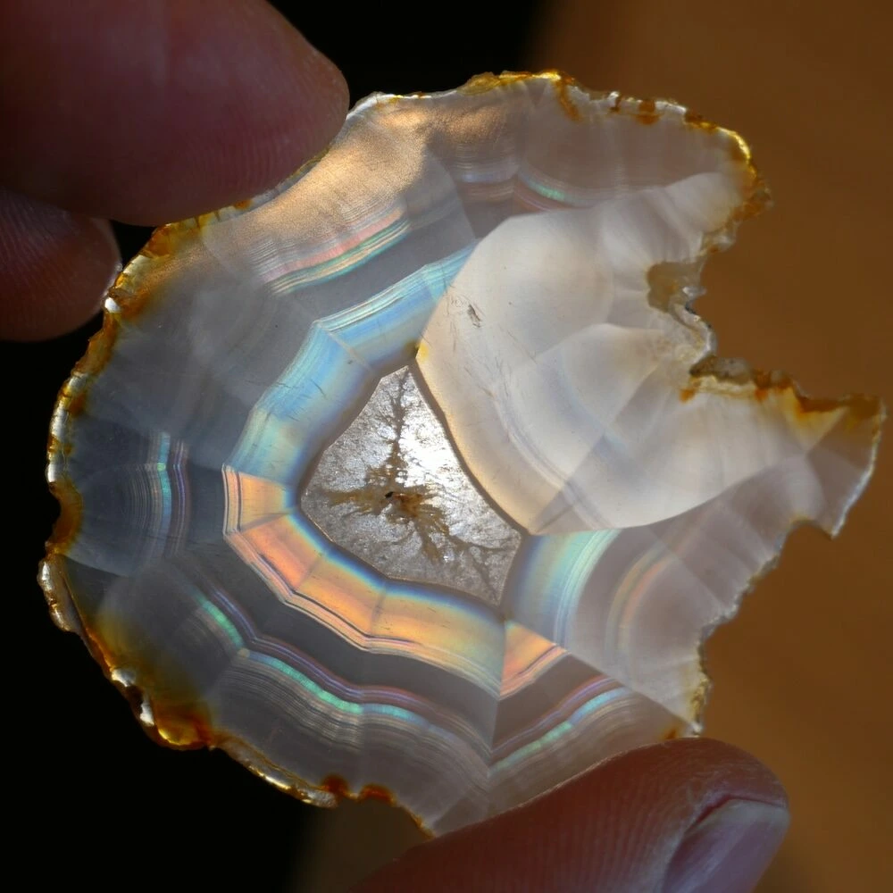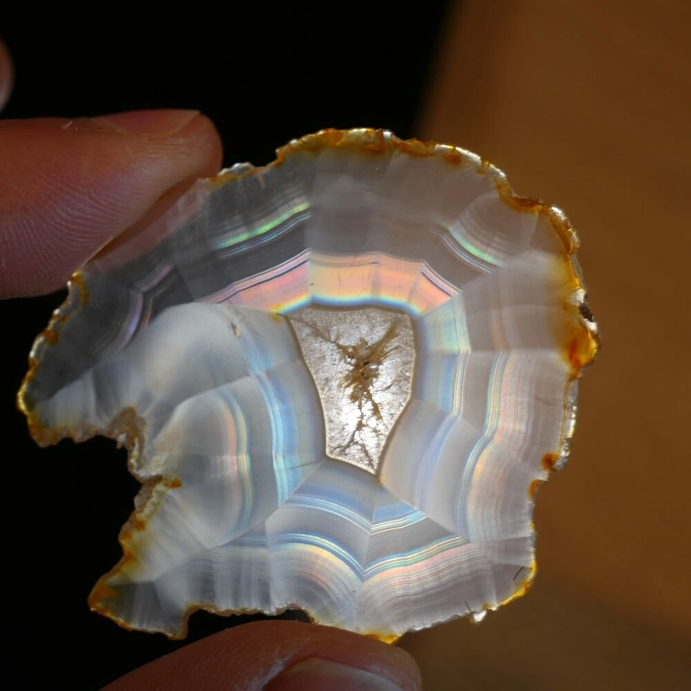 Iris agaat is een zeldzame en bijzondere vorm van agaat die bekend staat om zijn iriserende werking. Wanneer er licht door de steen schijnt, ontstaan er regenboogachtige kleuren. Deze ‘regenboogjes’ zijn het gevolg van extreem fijne, parallelle lagen in de steen die het licht breken. Iris agaat behoort, net als andere agaatsoorten, tot de chalcedoonfamilie en daarmee tot de kwartsgroep, met een hardheid van 7.