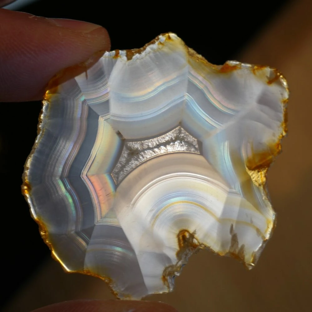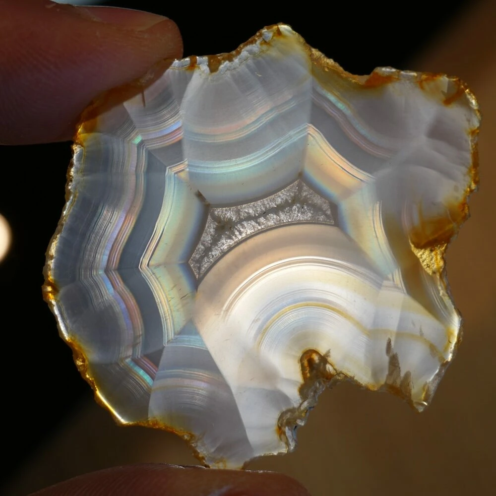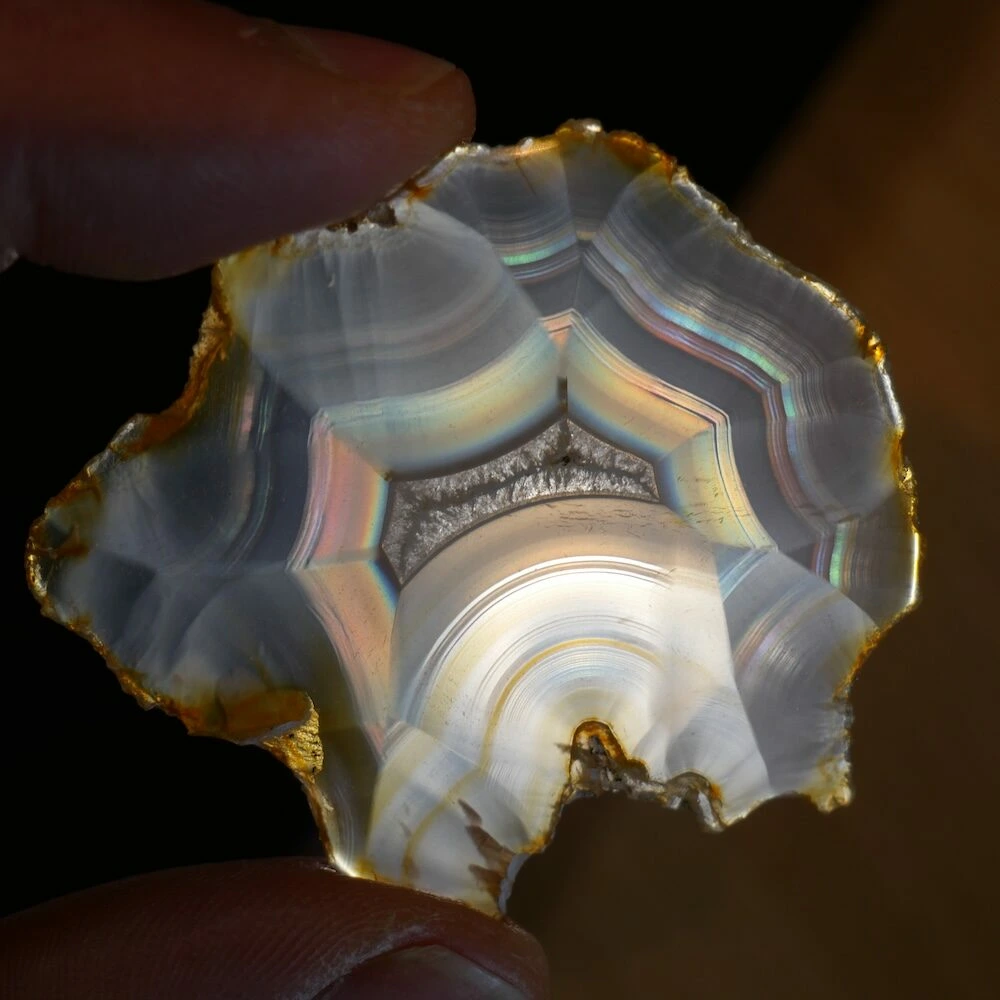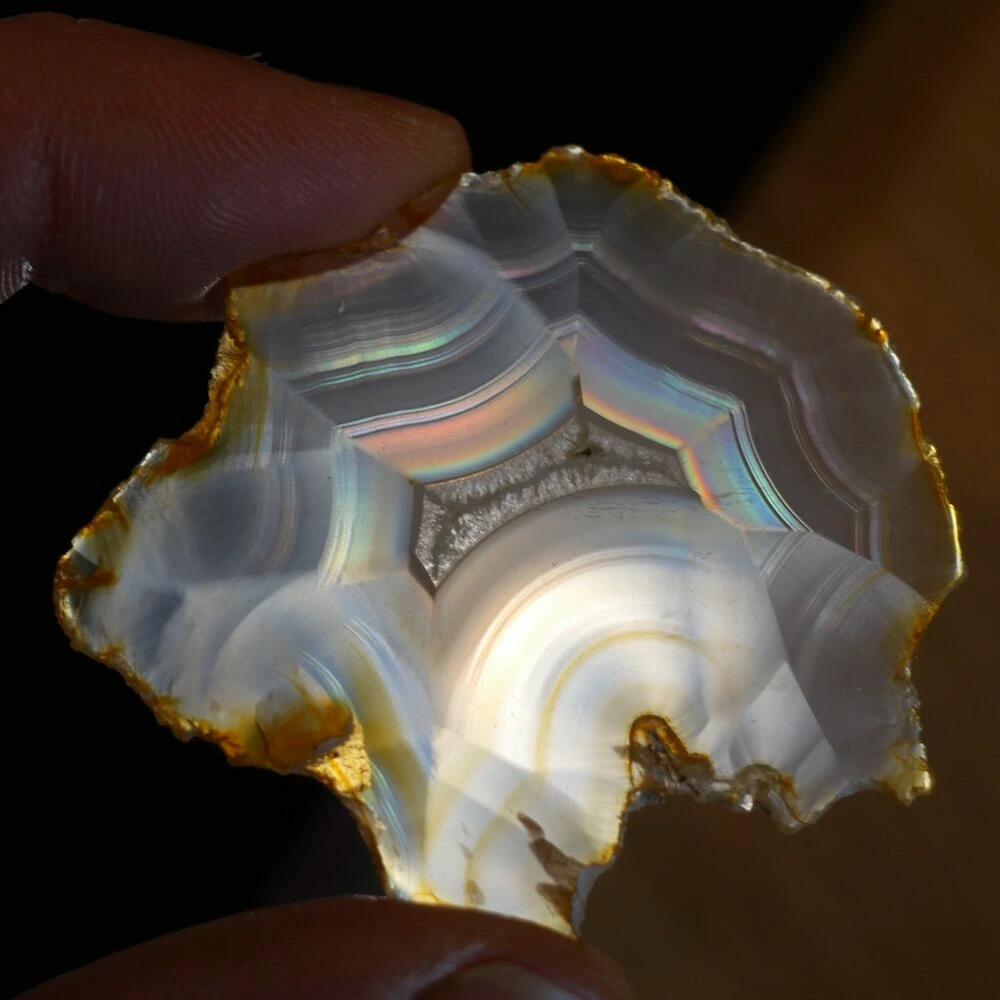 Iris agaat is een zeldzame en bijzondere vorm van agaat die bekend staat om zijn iriserende werking. Wanneer er licht door de steen schijnt, ontstaan er regenboogachtige kleuren. Deze ‘regenboogjes’ zijn het gevolg van extreem fijne, parallelle lagen in de steen die het licht breken. Iris agaat behoort, net als andere agaatsoorten, tot de chalcedoonfamilie en daarmee tot de kwartsgroep, met een hardheid van 7.