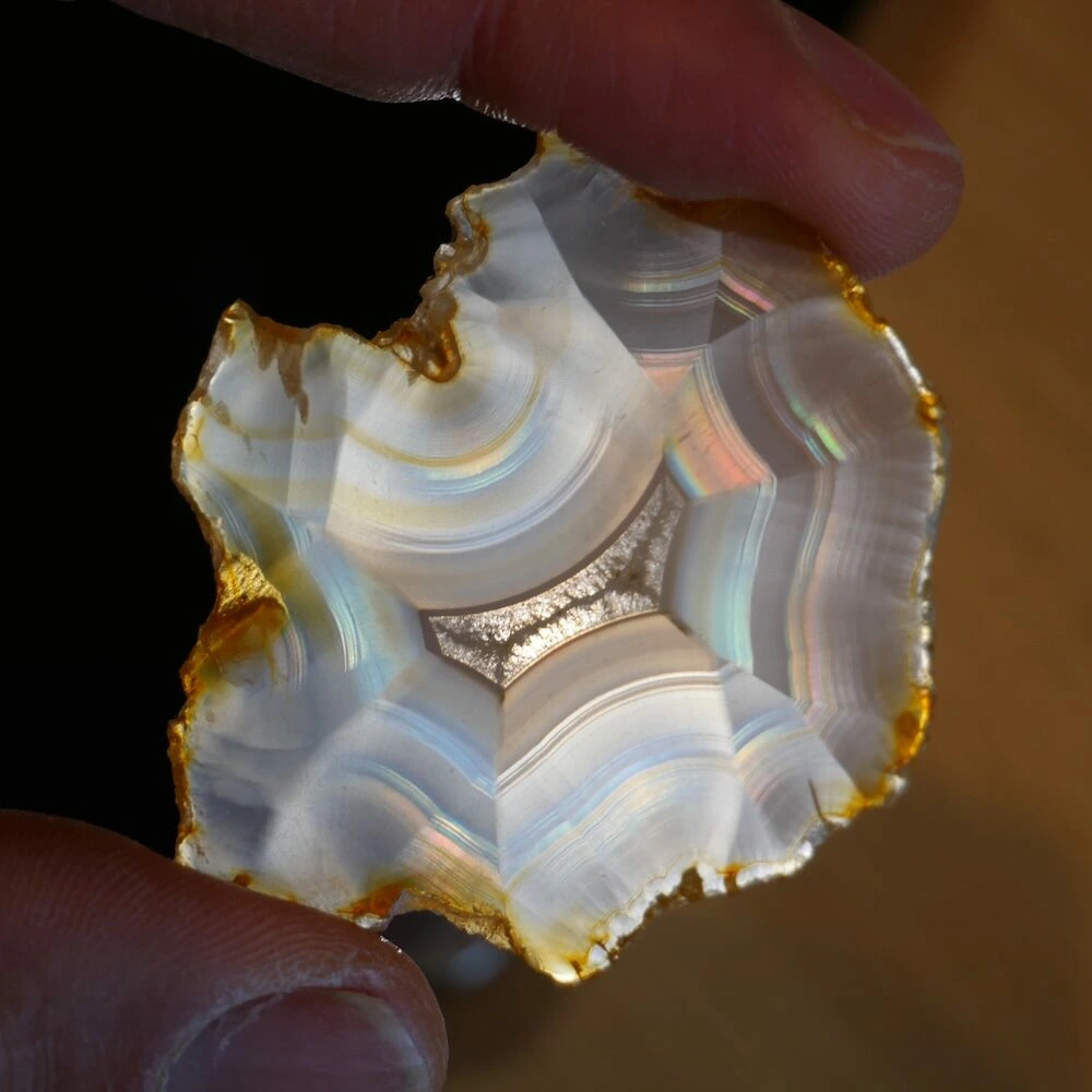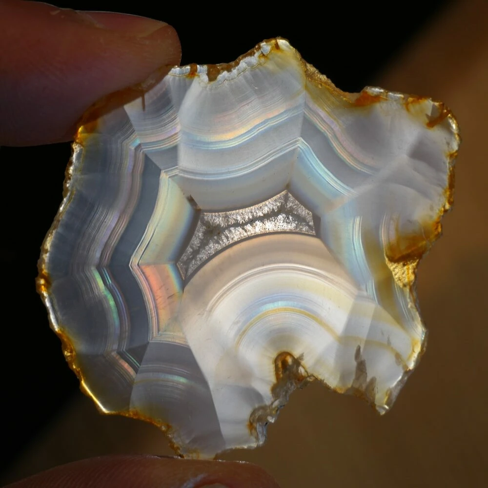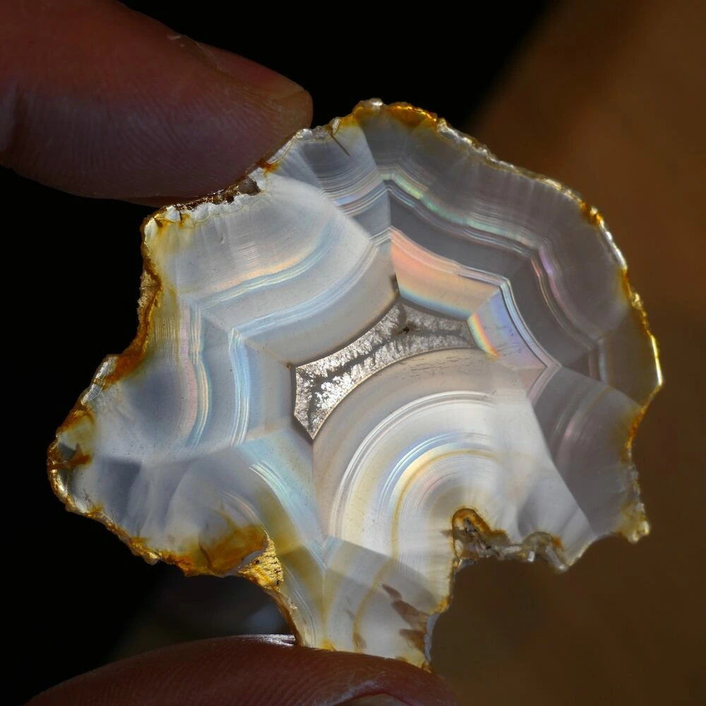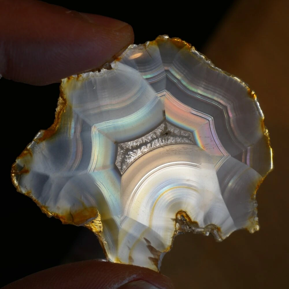 Iris agaat is een zeldzame en bijzondere vorm van agaat die bekend staat om zijn iriserende werking. Wanneer er licht door de steen schijnt, ontstaan er regenboogachtige kleuren. Deze ‘regenboogjes’ zijn het gevolg van extreem fijne, parallelle lagen in de steen die het licht breken. Iris agaat behoort, net als andere agaatsoorten, tot de chalcedoonfamilie en daarmee tot de kwartsgroep, met een hardheid van 7.
