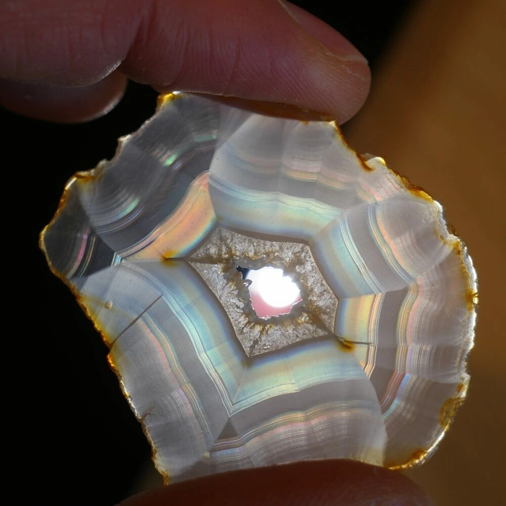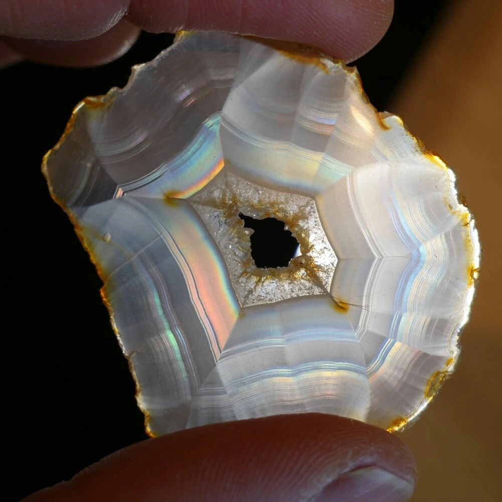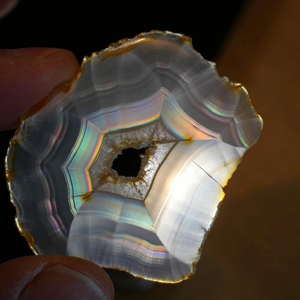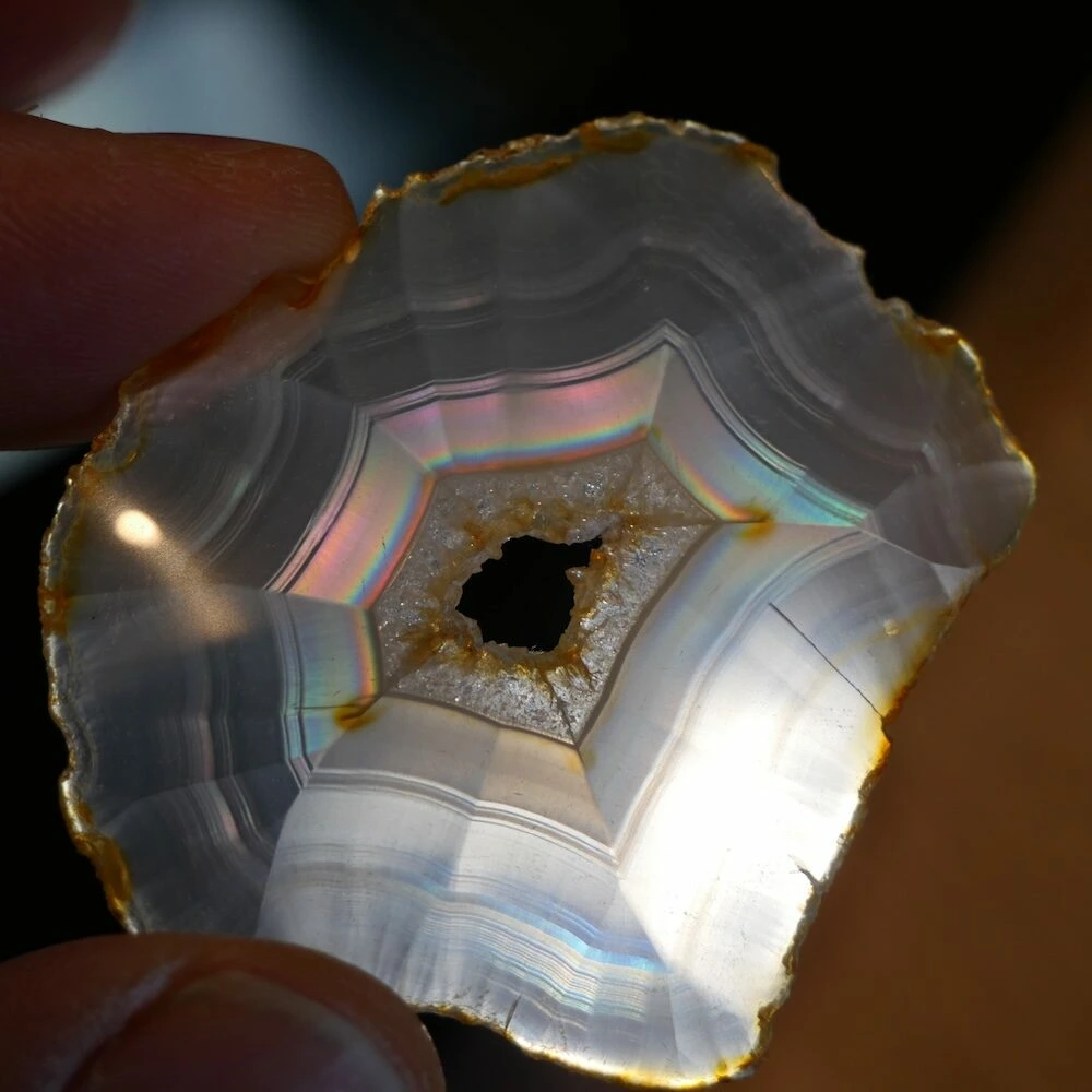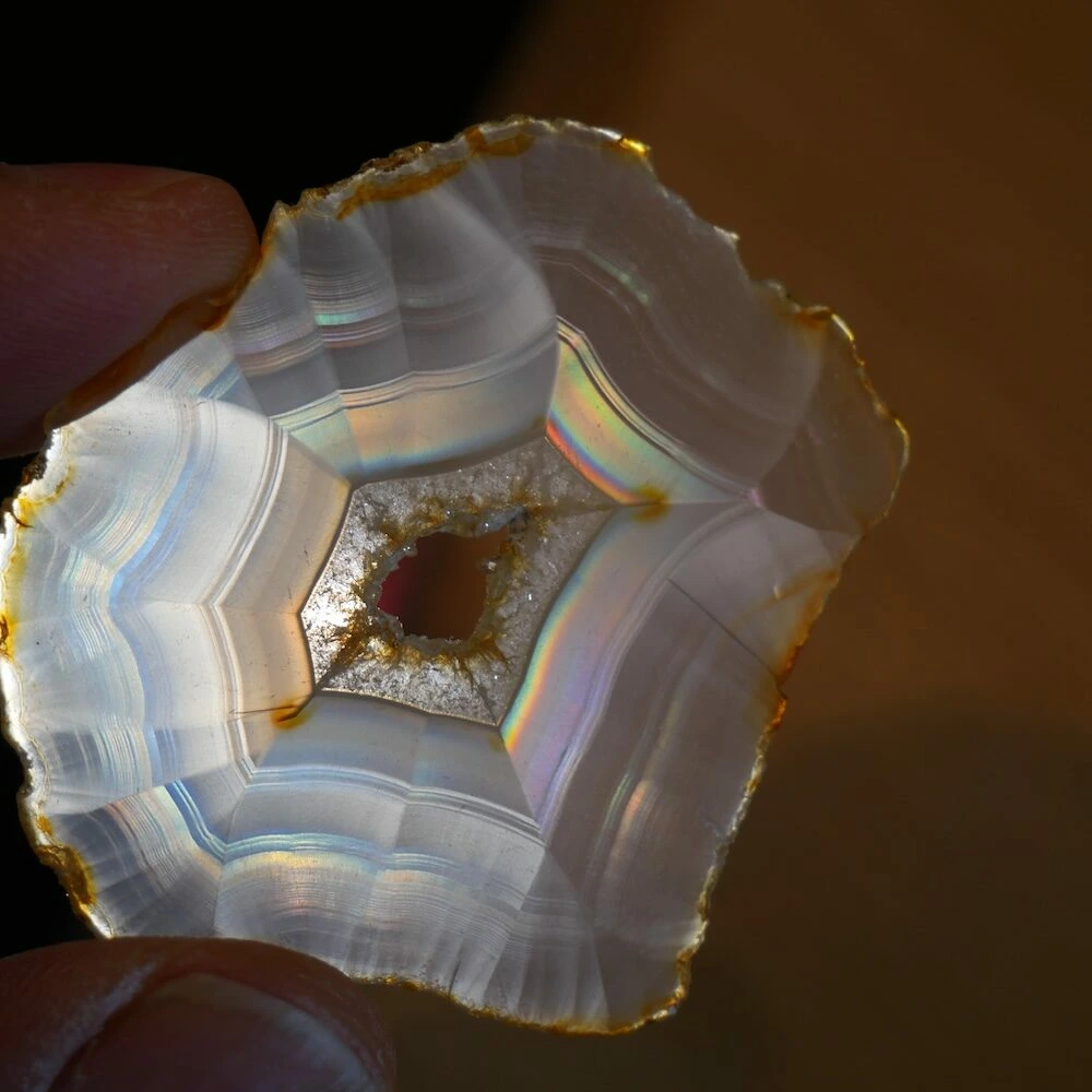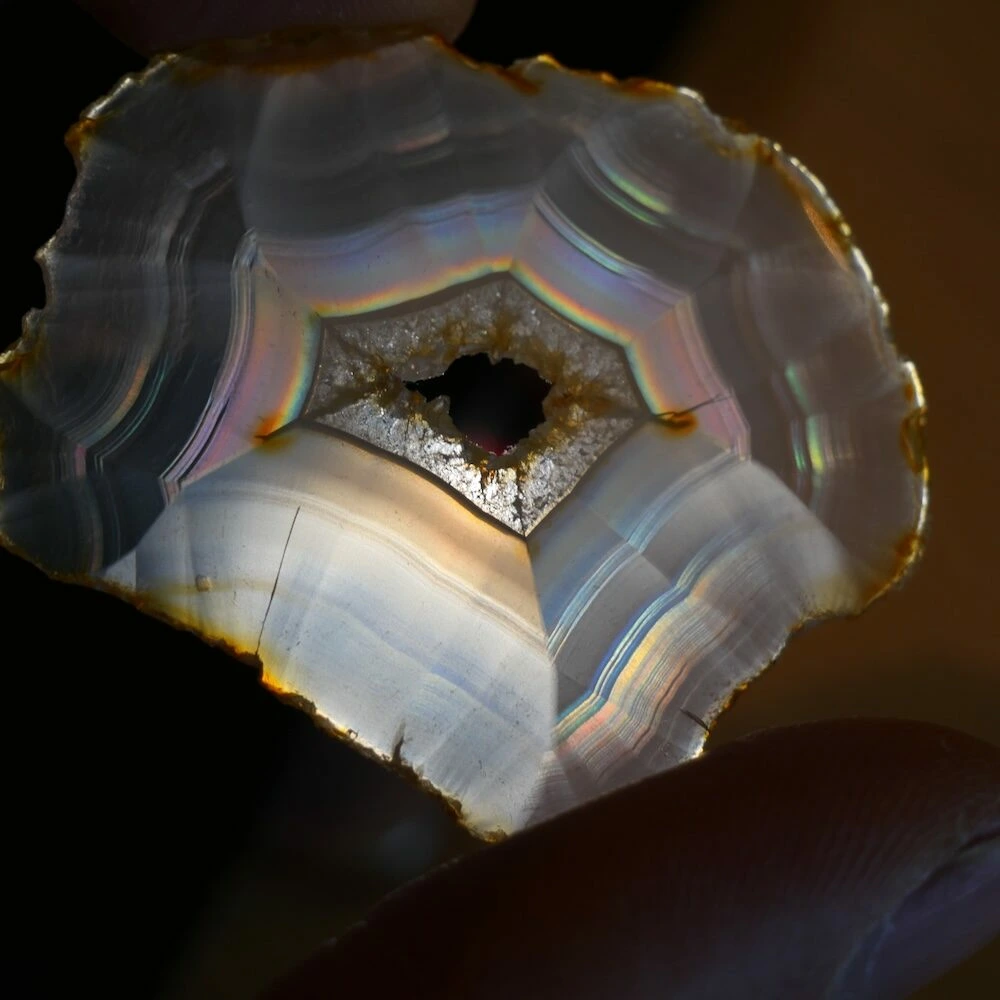 Iris agaat is een zeldzame en bijzondere vorm van agaat die bekend staat om zijn iriserende werking. Wanneer er licht door de steen schijnt, ontstaan er regenboogachtige kleuren. Deze ‘regenboogjes’ zijn het gevolg van extreem fijne, parallelle lagen in de steen die het licht breken. Iris agaat behoort, net als andere agaatsoorten, tot de chalcedoonfamilie en daarmee tot de kwartsgroep, met een hardheid van 7.