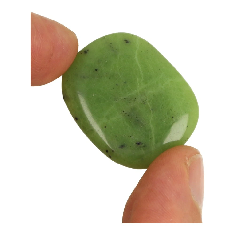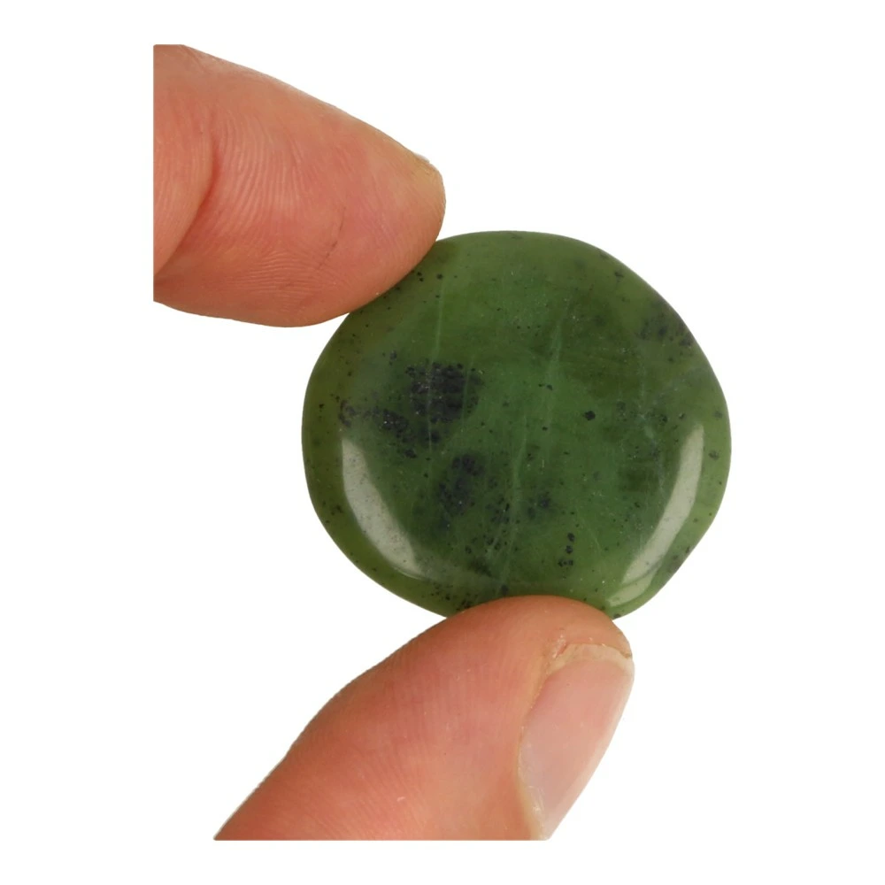 Fraaie groene jade nefriet amulet van circa 3-3,5cm lang en 1cm dik uit Canada. Je ontvangt een soortgelijk jade nefriet amulet of platte zaksteen als op de foto. Door zijn vorm is deze jade nefriet amulet fijn om in je broekzak of BH te dragen.