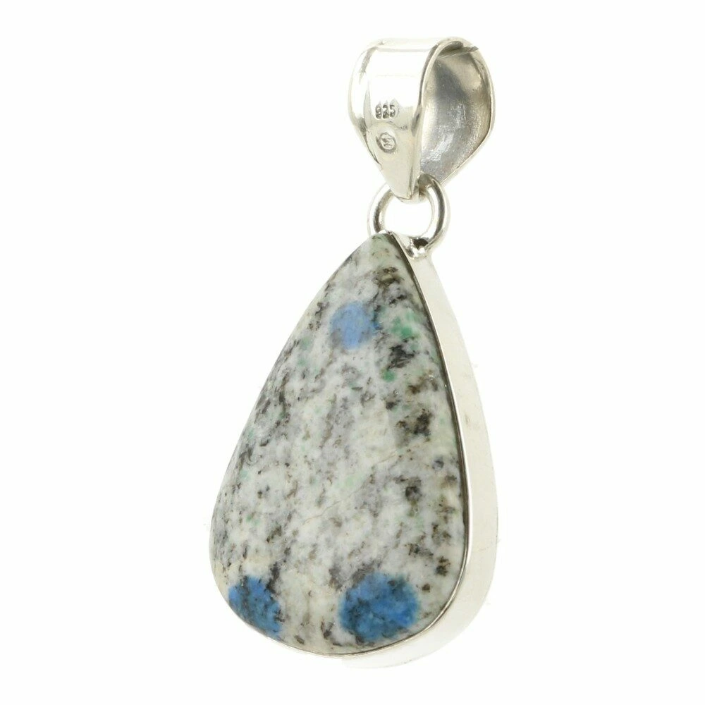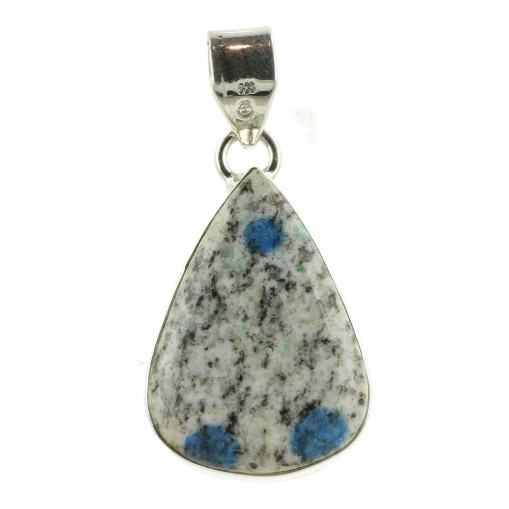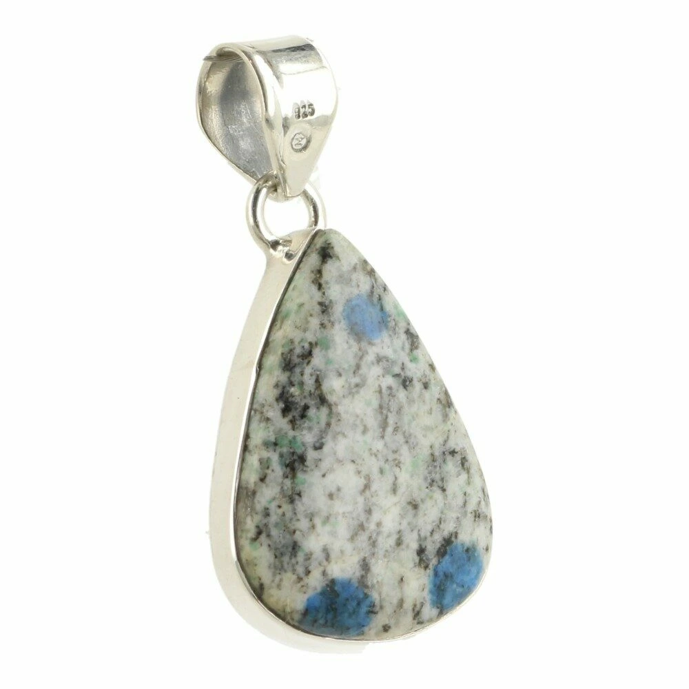 Wit met blauwe K2 jaspis hanger in zilver ‘nr1’. Deze K2 jaspis is gezet in juwelierskwaliteit 925 sterling zilver. De afmeting van de K2-jaspis steen in de hanger is ongeveer 28mm hoog en 20mm breed. Je ontvangt de K2 jaspis hanger in zilver van de foto.