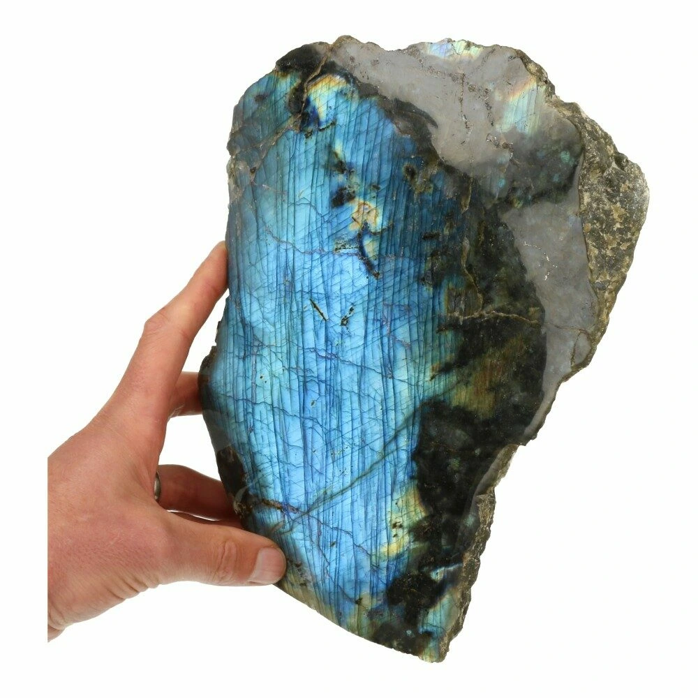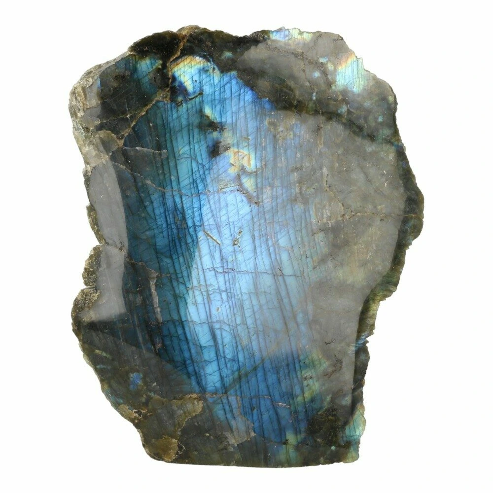 Fraaie labradoriet enkelzijdig gepolijst uit Madagaskar. Deze ruwe labradoriet heeft een groot gepolijst vlak en staat mooi rechtop. De voorzijde heeft een mooie blauwe glans en is in het echt nog mooier dan op de foto’s. De afmetingen zijn ongeveer 25cm hoog, 20cm breed en 7cm diep. Je ontvangt uiteraard de half gepolijste labradoriet van de foto.