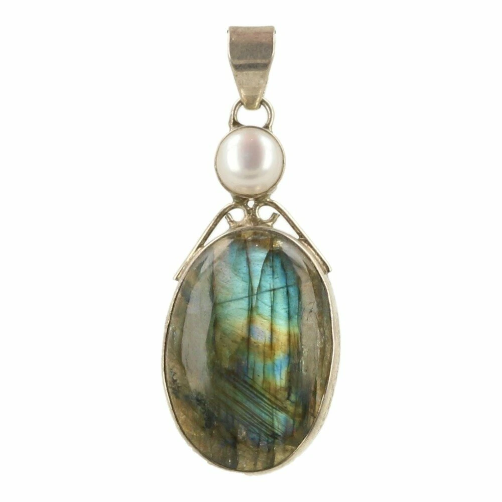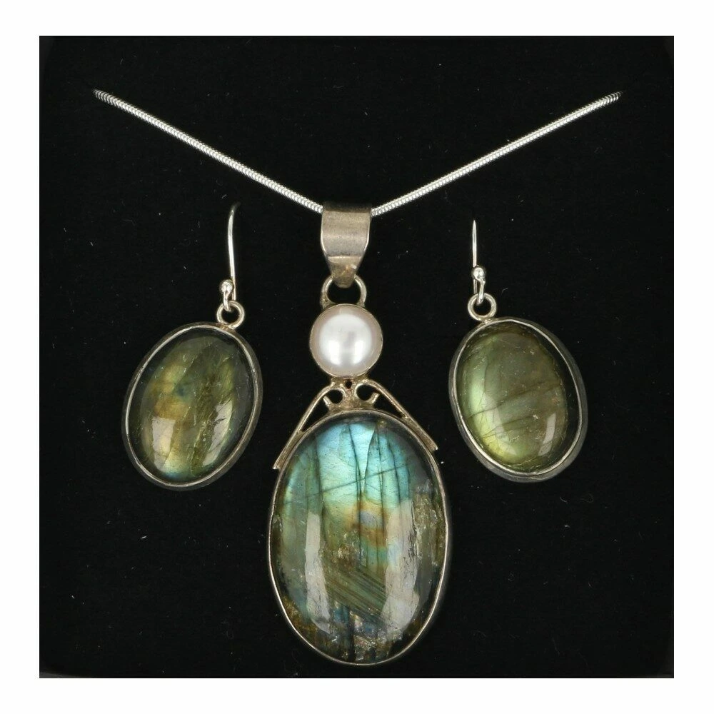 Een fraaie labradoriet sieradenset in zilver in luxe geschenkdoosje. Deze labradoriet sieradenset bestaat uit een fraai ovaal geslepen labradoriet hanger in zilver met mooie kleurschakeringen en een parel aan de bovenzijde. Deze hanger komt aan een zilveren slang ketting van 45cm lengte. Om de set af te maken zit er een set labradoriet oorhangers in zilver bij. Alle onderdelen van deze labradoriet sieraden set zijn gemaakt van juwelierskwaliteit 925 sterling zilver. Je ontvangt de set van de foto.