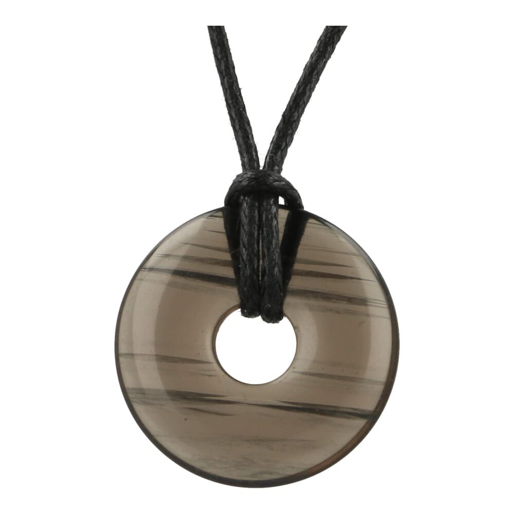 Mooie donker bruin met zwarte strepen lamellen obsidiaan donut hanger met een diameter van 30mm aan zwart waxkoord uit Armenië. Je ontvangt een soortgelijke lamellen obsidiaan donut hanger als op de foto.