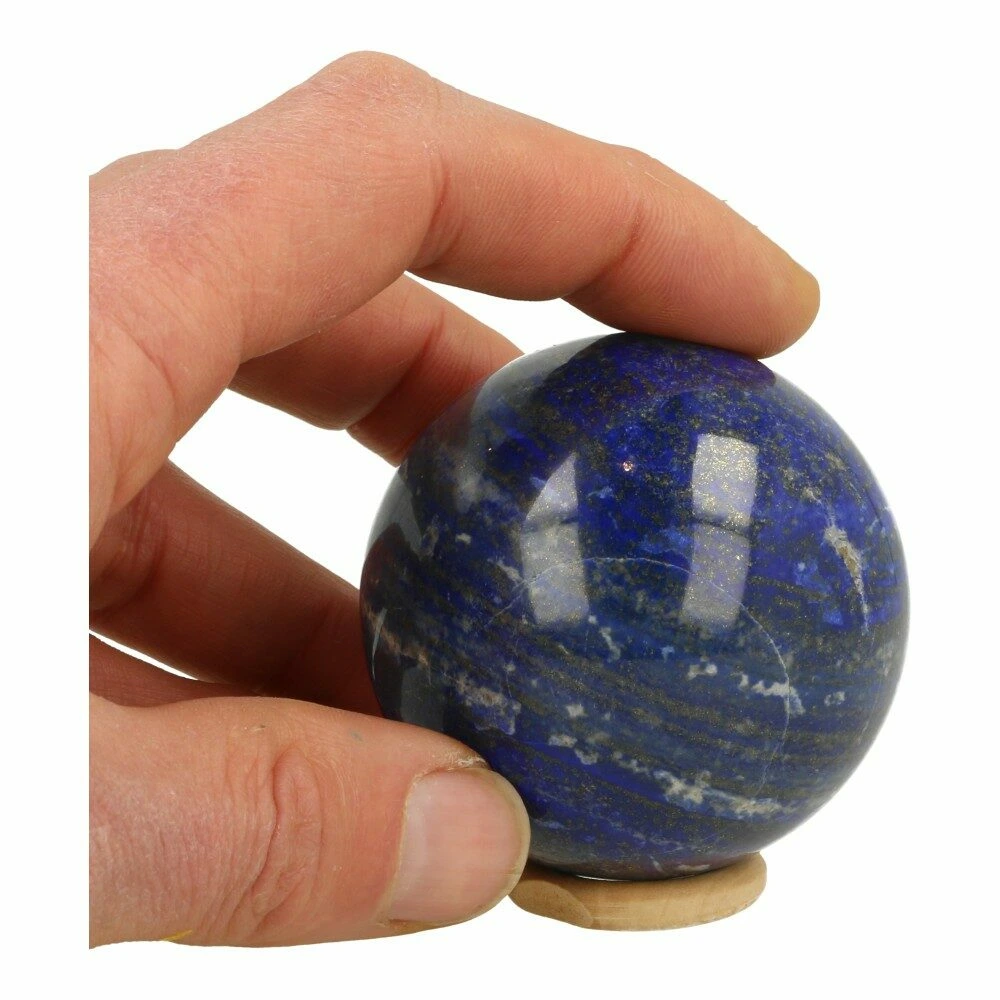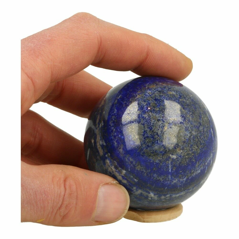 Fraaie diepblauwe lapis lazuli bol met een diameter van 61mm met pyriet insluitsels. Je ontvangt de bol van de foto met een houten ring. Prachtig zachte energie en de kenmerkende diepe kleur uit Afghanistan.