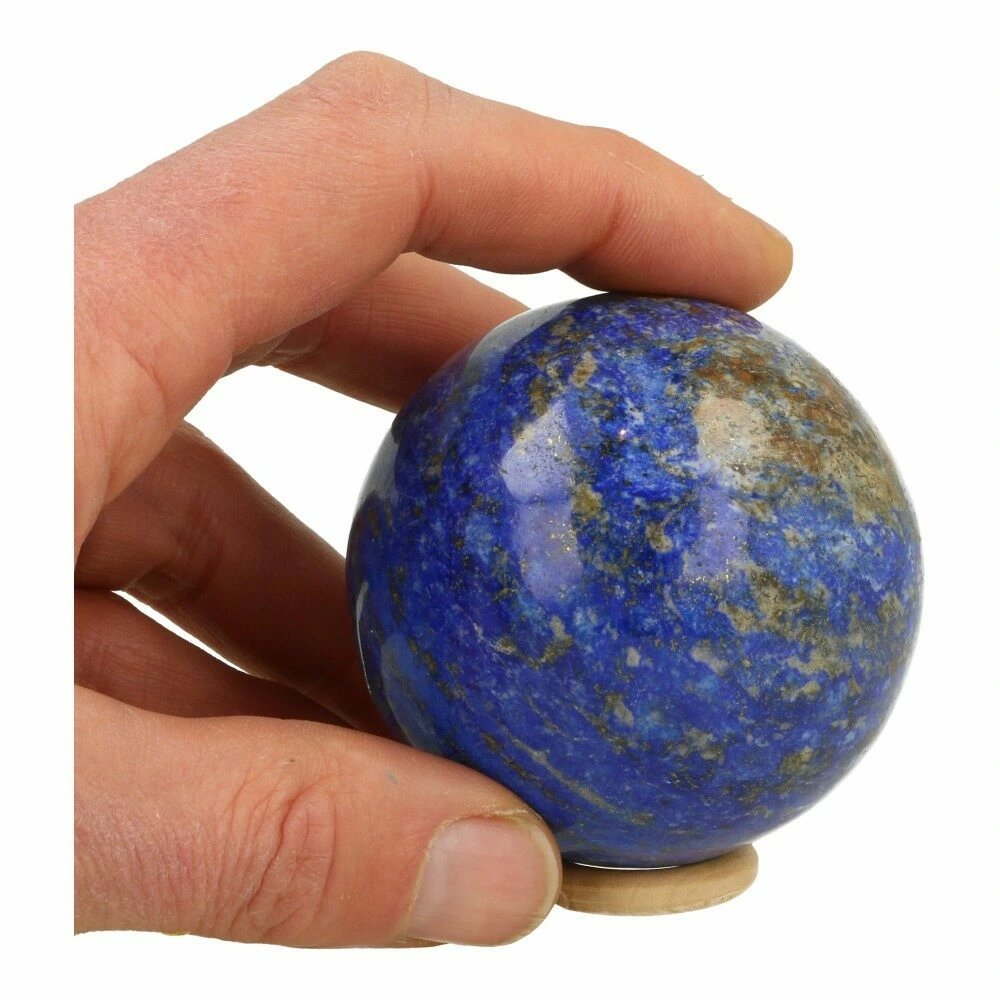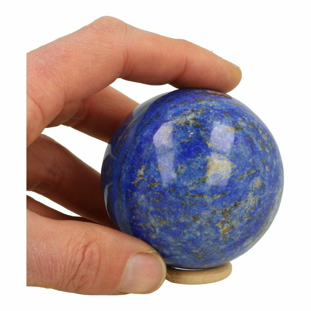 Fijne donkerblauwe lapis lazuli bol met een diameter van 68mm uit Afghanistan. Je ontvangt de lapis lazuli bol van de foto met een houten ringetje. De bol heeft een fraaie donkerblauwe kleur met veel pyriet insluitsels en heeft een heldere en frisse energie.
