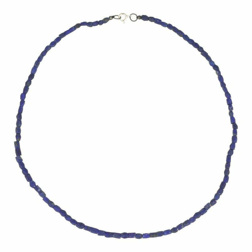 Fraaie diepblauwe lapis lazuli ketting 4mm met geblokte kralen en een lengte van 45cm. De sluiting van deze lapis lazuli ketting is van zilver. De kralen zijn ‘geblokt’ en hebben een fraai patroon met schuine zijdes met een afmeting van ongeveer 4mm diameter en 5mm hoog. Topkwaliteit lapis lazuli, waarbij alle kleine reststukjes zijn gebruikt voor de ketting. Je ontvangt een soortgelijke lapis lazuli ketting als op de foto, de kwaliteit is zeer gelijkwaardig.