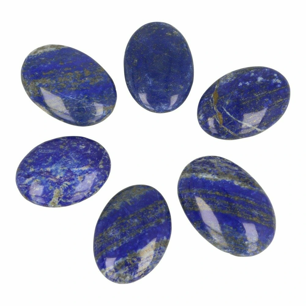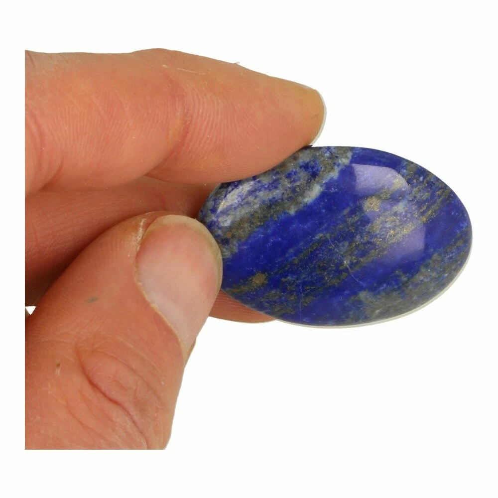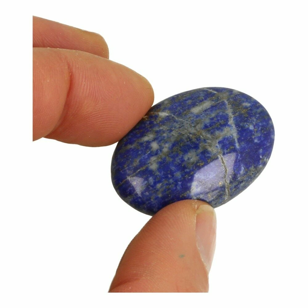 Mooie kwaliteit diepblauwe lapis lazuli zaksteen ovaal met witte calciet en pyriet insluitsels. De afmeting van deze lapis lazuli zaksteen ovaal is ongeveer 3,7-4,3 cm lang, 2,7-3cm breed en 1-1,5cm dik. Iedere lapis lazuli zaksteen ovaal is uniek, maar uitgezocht op kwaliteit.