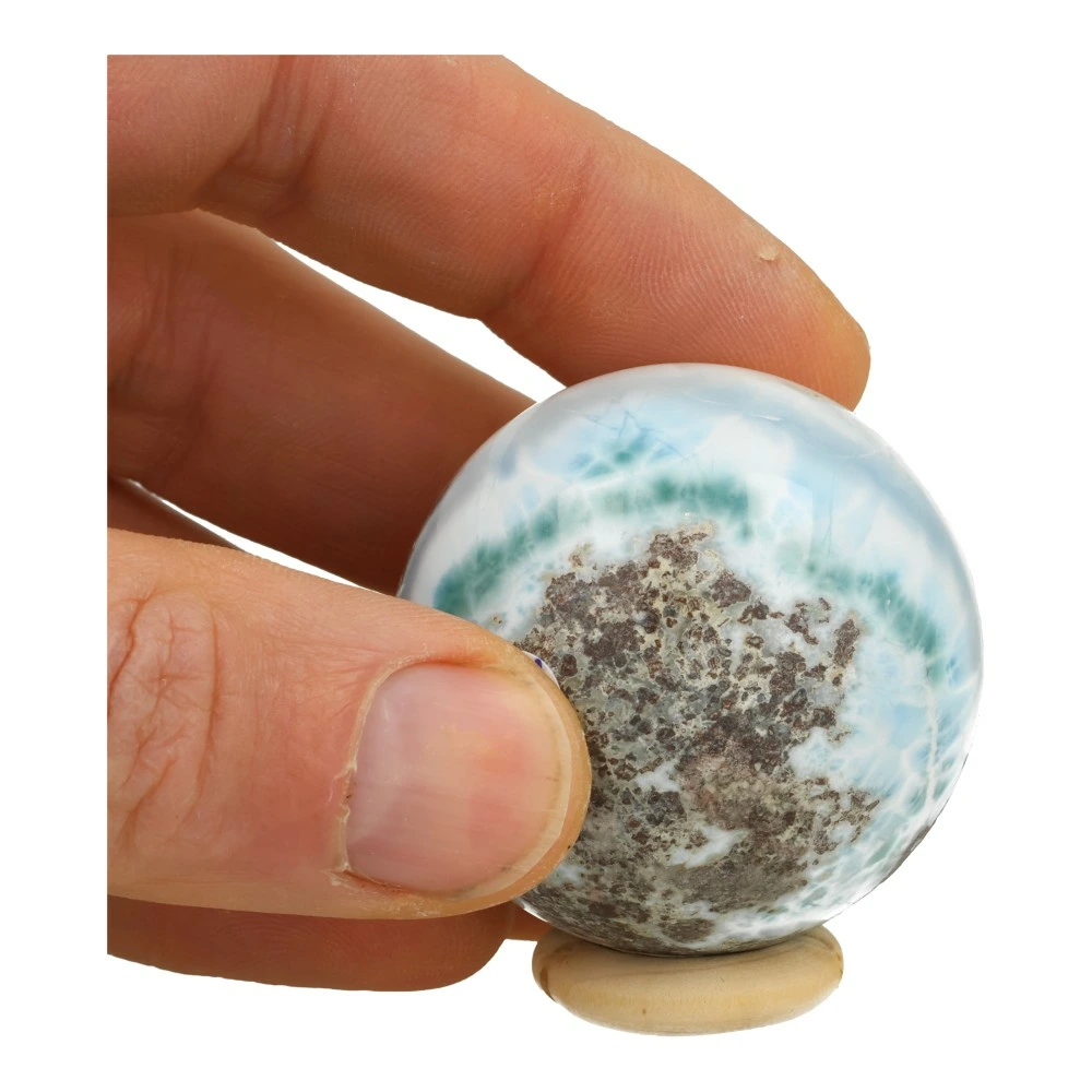 Fraaie larimar bol met diameter van circa 46mm ‘nr1’ op houten ring en met fraaie tekening. Je ontvangt uiteraard de larimar bol van de foto, een fraaie bol die rust, ruimte en verdieping biedt. De ‘nr1’ aanduiding is puur om de verschillende bollen met dezelfde diameter te identificeren en zegt niets over de kwaliteit. Deze larimar bol heeft een heldere energie en nodigt je uit om te spelen en je bewustzijn te verruimen. Een unieke bol van een zeldzaam mineraal.