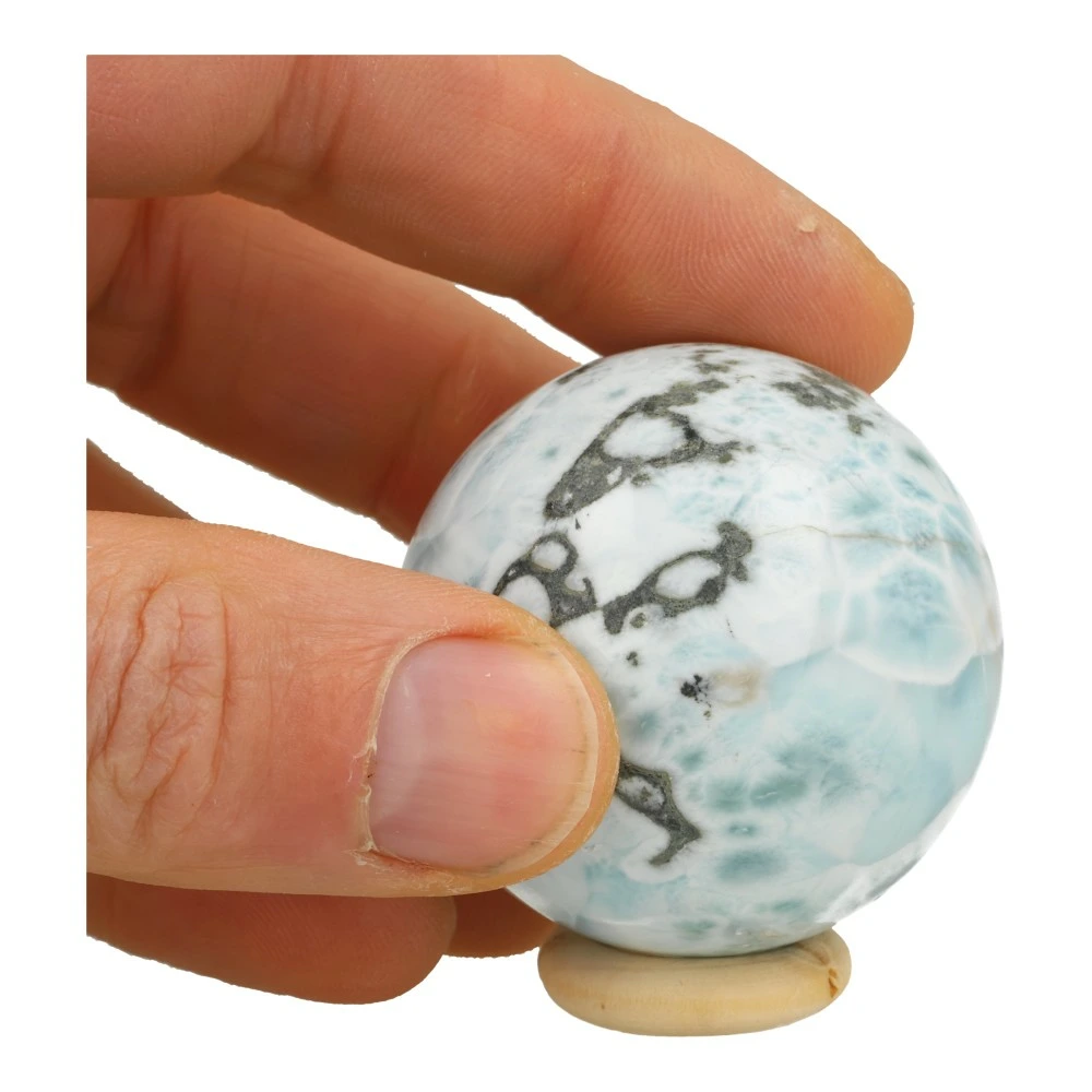 Fraaie larimar bol met diameter van circa 47mm op houten ring en met fraaie tekening. Je ontvangt uiteraard de larimar bol van de foto, een fraaie bol die helderheid, ruimte en verdieping biedt. Deze larimar bol heeft een verhelderende energie die het denken verruimt en je uitnodigt om je liefdevol uit te spreken. Ze geeft verdieping en nodigt je uit je bewustzijn te verruimen. Een unieke bol van een zeldzaam mineraal.