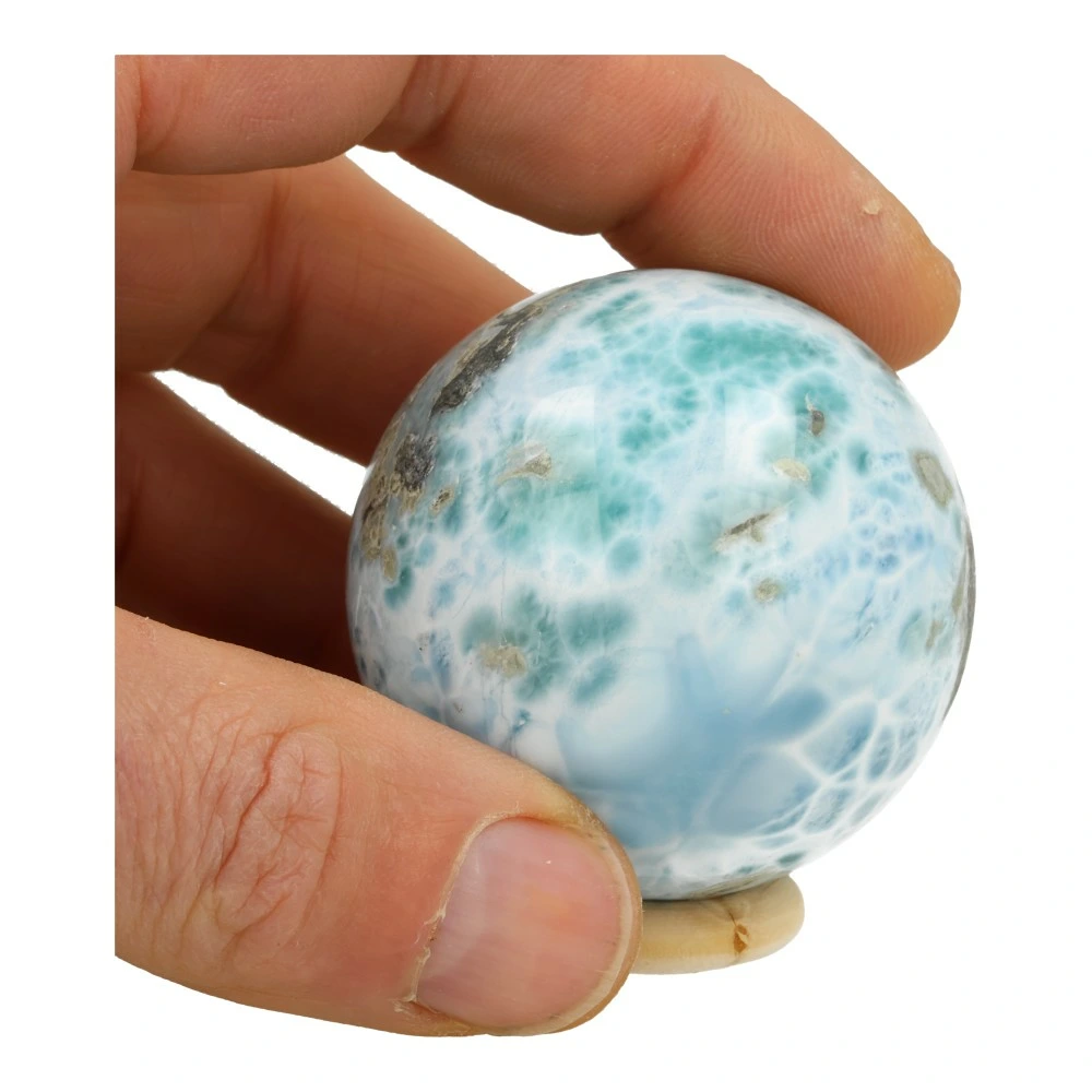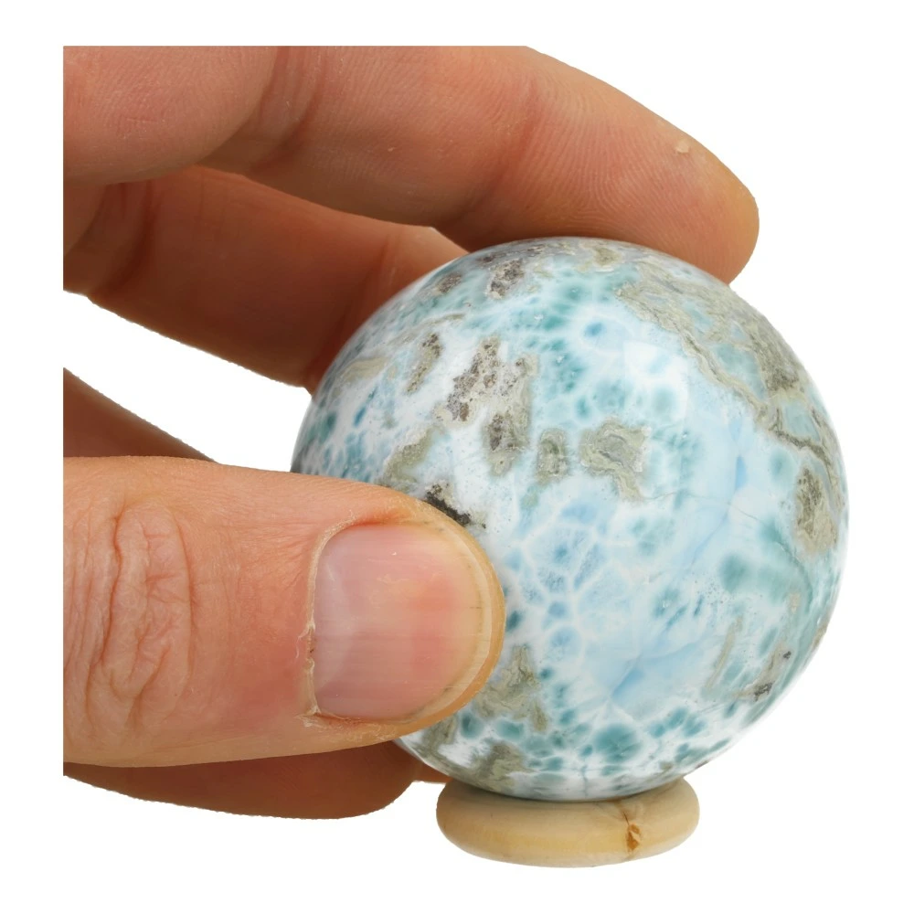 Fraaie larimar bol met diameter van ruim 51mm op houten ring en met fraaie tekening. Je ontvangt uiteraard de larimar bol van de foto, een fraaie bol die frisheid, ruimte en verdieping biedt. Deze larimar bol heeft een heerlijke energie met hoge frequentie die je meeneemt in de speelse energie van de oceaan, dolfijnen en zo vastzittende, oude energie helpt losweken en los spoelen. Ze geeft ontspanning en nodigt je uit je bewustzijn te verruimen. Een unieke bol van een zeldzaam mineraal.