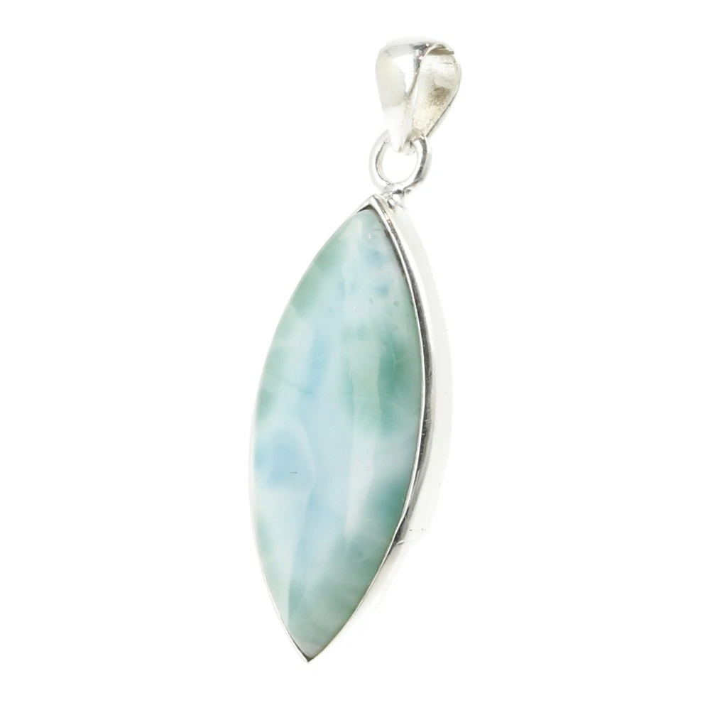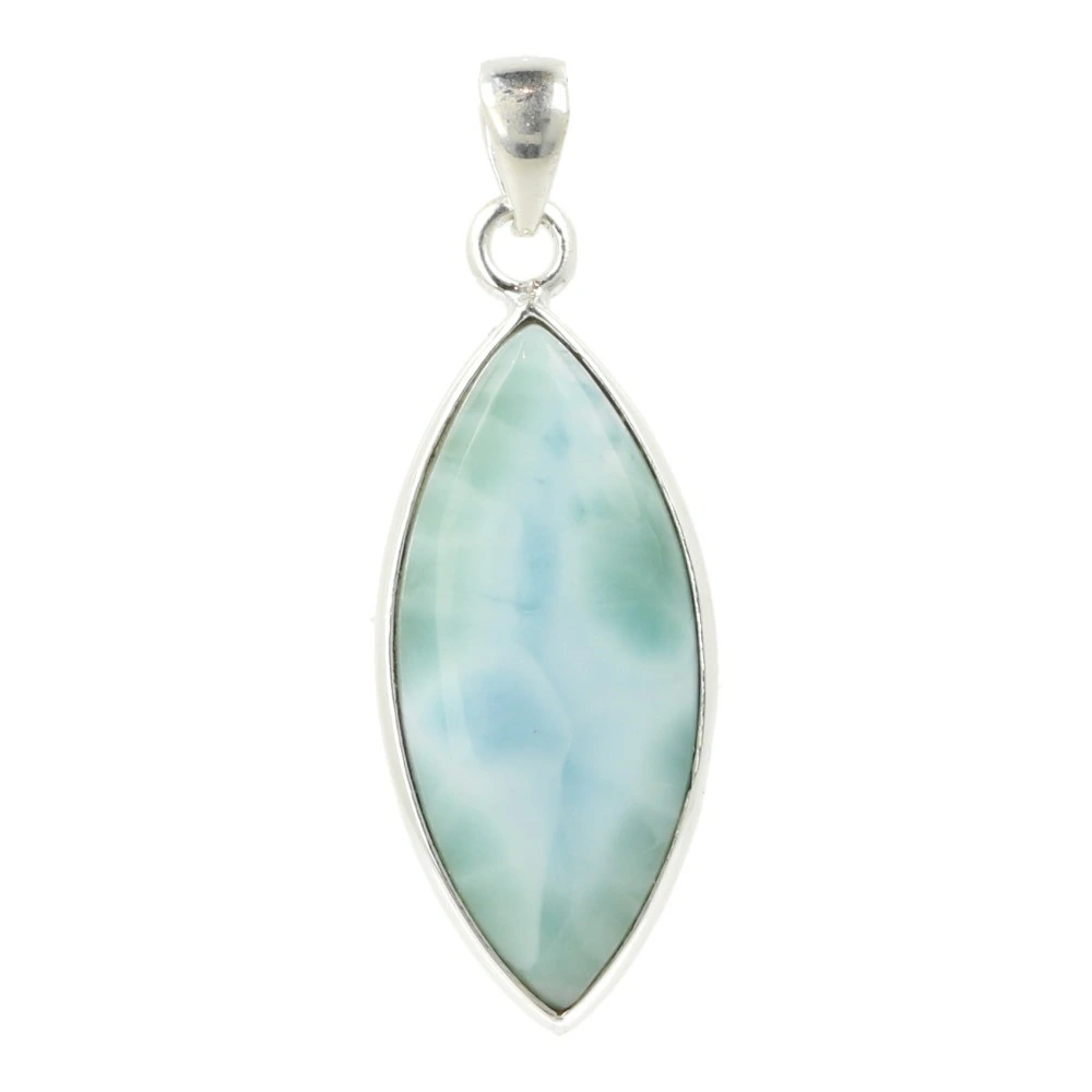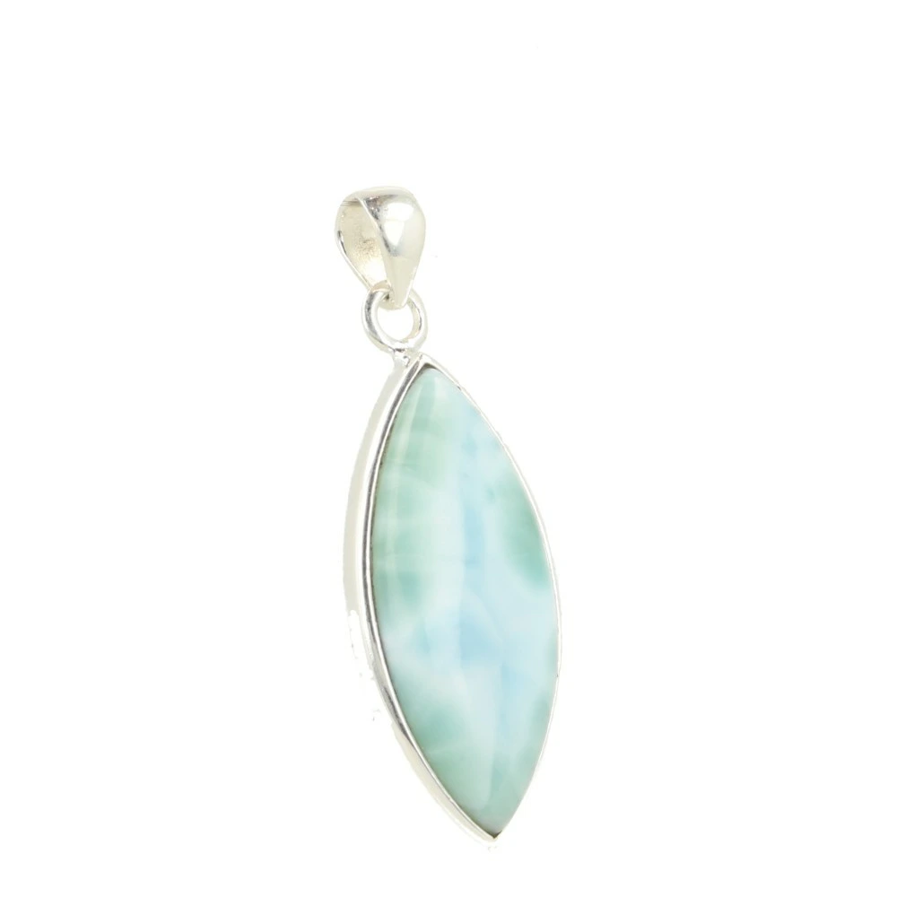 Mooie larimar hanger in zilver uit de Dominicaanse Republiek. Deze fraaie larimar steen in de hanger heeft een afmeting van 36mm hoog en 15mm breed. De hanger is gemaakt van 925 sterling zilver van juwelierskwaliteit. Je ontvangt deze larimar hanger in zilver van de foto.