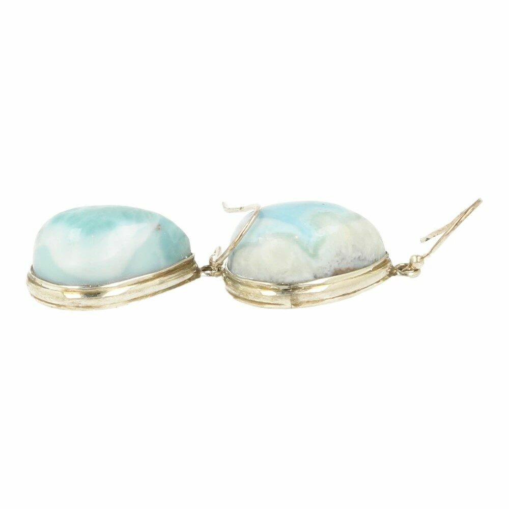 Mooie larimar oorbel in zilver groot in oorhanger uitvoering met larimar in bolgeslepen druppelvorm uit de Dominicaanse Republiek. De larimar oorbel is gemaakt van juwelierskwaliteit 925 sterling zilver. De afmeting van de larimar in de oorbel is ongeveer 20mm hoog en 15mm breed. Je ontvangt de larimar oorbellen van de foto.