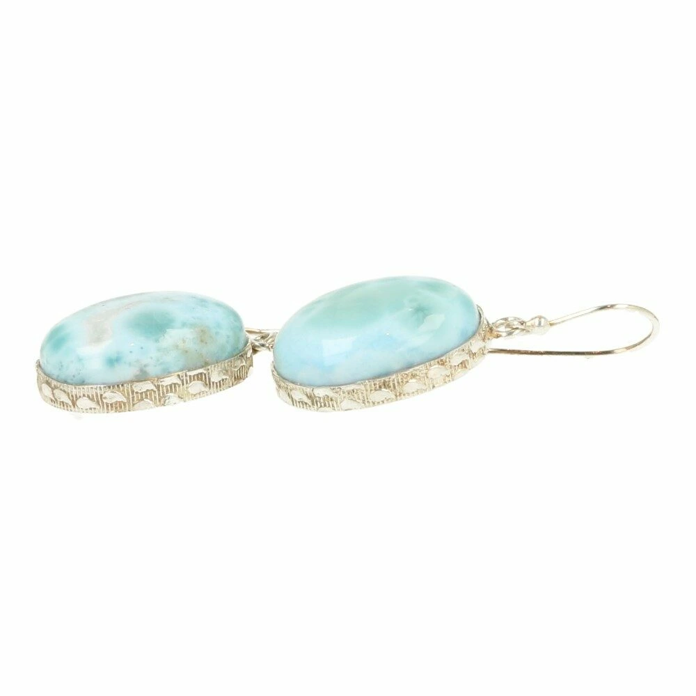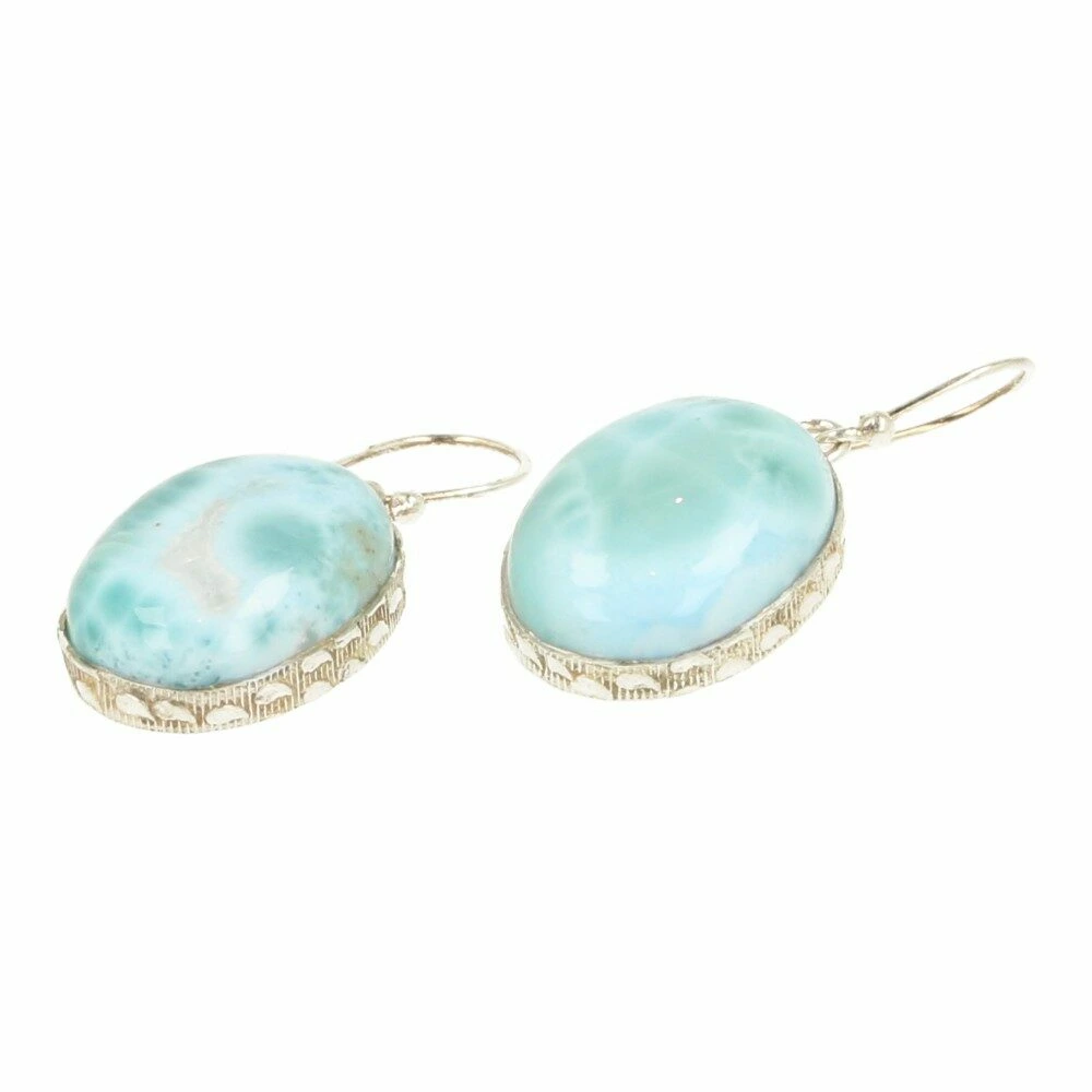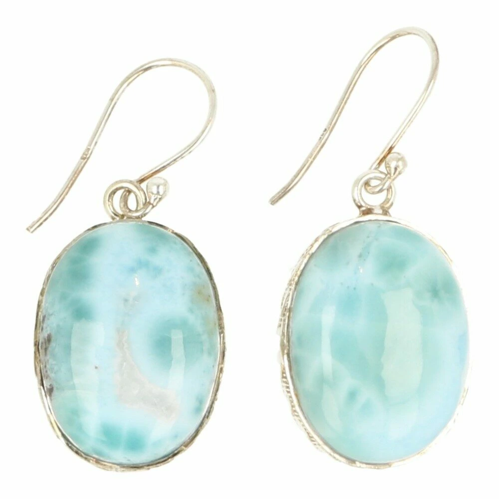 Mooie larimar oorbel in zilver groot in oorhanger uitvoering met larimar in bolgeslepen ovale vorm uit de Dominicaanse Republiek. De larimar oorbel is gemaakt van juwelierskwaliteit 925 sterling zilver met sierlijk werkje aan de zijkant. De afmeting van de larimar in de oorbel is ongeveer 20mm hoog en 14mm breed. Je ontvangt de larimar oorbellen van de foto.