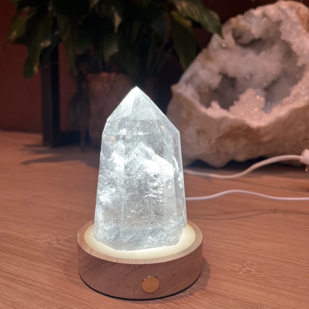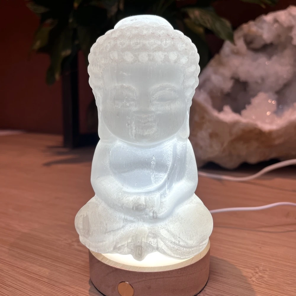 De natuurlijke houten behuizing geeft het lampje een rustige, aardse uitstraling die perfect past bij een meditatieruimte, spirituele plek of gewoon als aankleding in huis.