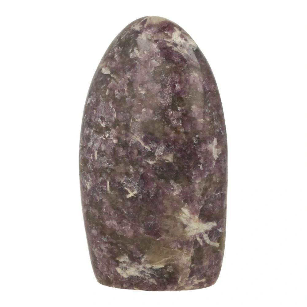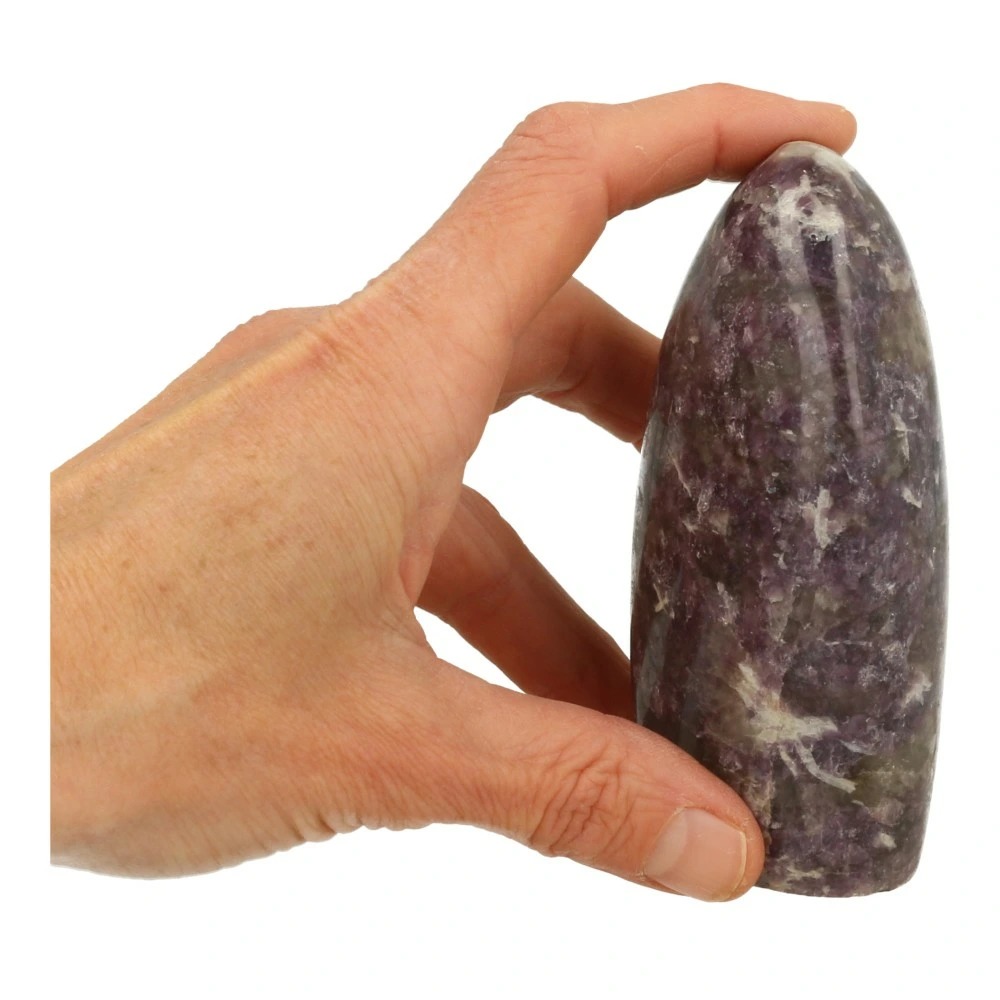 Prachtig gepolijste lepidoliet vrije vorm met mooie glinstering en een afmeting van 108mm hoog, 62mm breed en 42mm diep uit Madagaskar. Je ontvangt de lepidoliet vrije vorm van de foto.