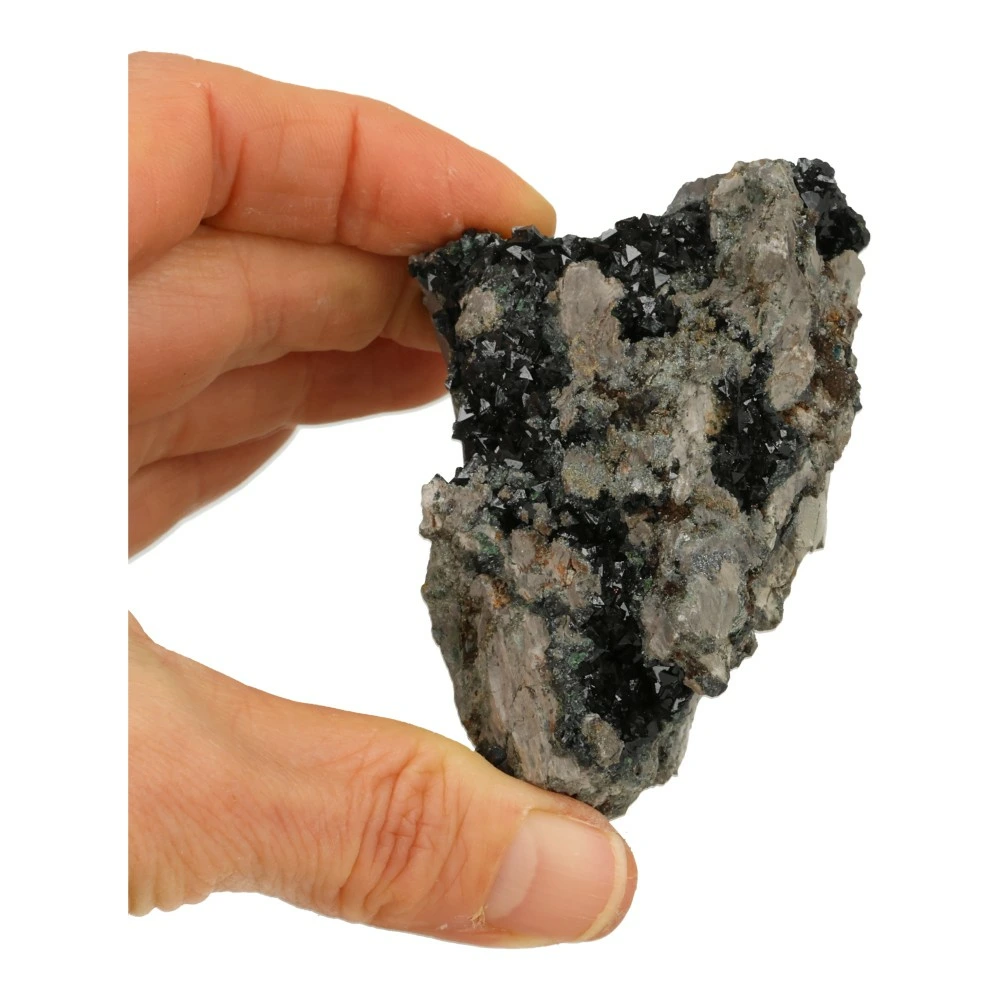 Fraaie libetheniet ruw nr16 uit Shituru, Congo. De afmetingen van dit unieke en zeldzame stuk zijn ongeveer 6,8cm breed, 5,3cm diep en 4,3cm hoog. Dit stukje heeft mooie donkergroene kristallen aan het oppervlak en in de verschillende holtes aan beide zijdes. Rondom een fraai stuk. Je ontvangt dit zeldzame stuk libetheniet van de foto.