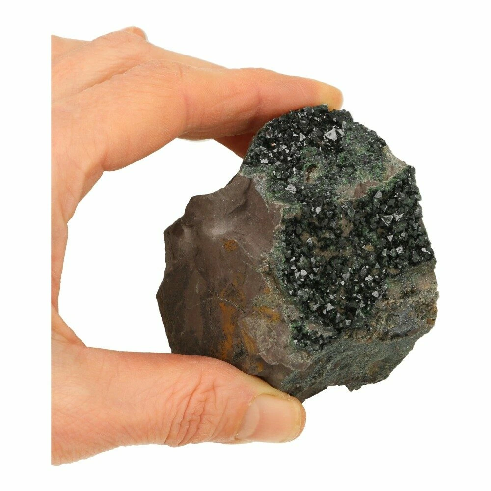 Fraaie libetheniet ruw nr6 uit Shituru, Congo. De afmetingen van dit unieke en zeldzame stuk zijn ongeveer 6,2cm breed, 6,2cm diep en 4,3cm hoog. Dit stukje heeft mooie losstaande donkergroene kristallen aan de bovenzijde. Je ontvangt dit zeldzame stuk libetheniet van de foto.