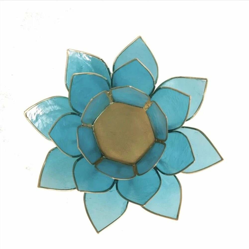 De lotus is het symbool van duisternis naar licht, van onwetendheid naar weten. De lotus staat ook symbool voor de 7 energiecentra in het menselijk lichaam, chakra’s genoemd. De blauwe kleur resoneert met het 5e chakra, wat staat voor zelfliefde, verbinding en openheid. De lotusblaadjes zijn gemaakt van capizschelpen. Capizschelpen zijn natuurproducten en kunnen kleine oneffenheden vertonen.