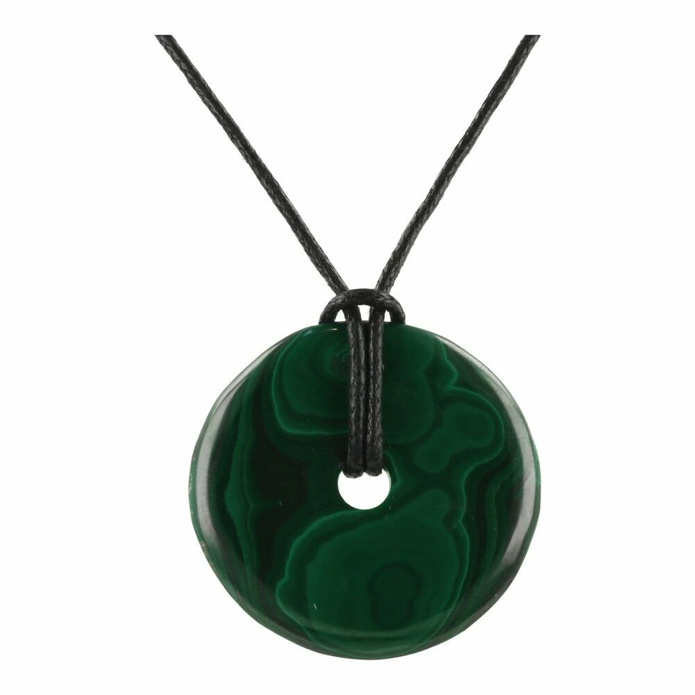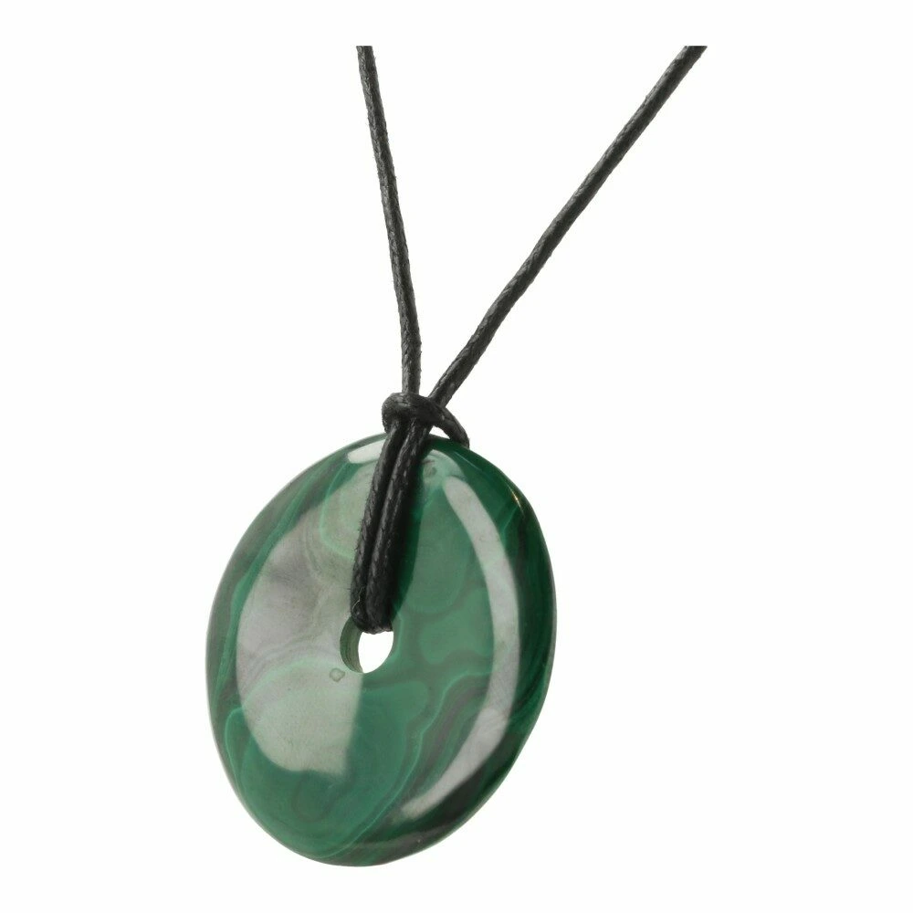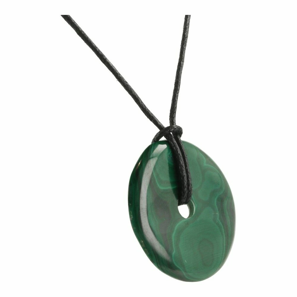 Mooie diepgroen geaderde malachiet donut hanger van circa 4cm diameter aan zwart koord. Je ontvangt een soortgelijke malachiet donut hanger als op de foto, iedere hanger is uniek in tekening.