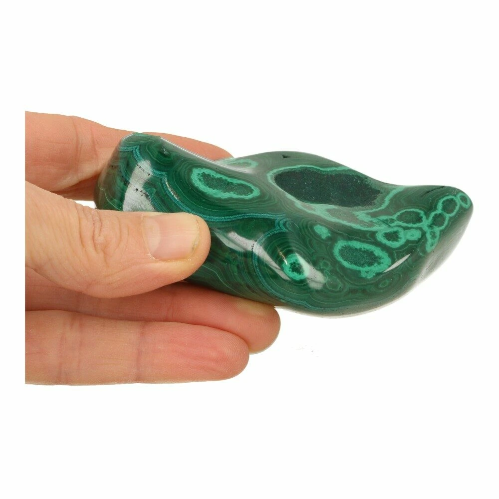 Prachtige diepgroene malachiet gepolijst uit Democratische Republiek Congo. Dit stuk gepolijste malachiet heeft een fraaie fijne tekening aan beide zijdes. Doordat de bolle groeivorm is gepolijst zijn de fraaie ronde lijnpatronen goed zichtbaar, en op de smalle zijde de laagjes waaruit de malachiet is opgebouwd. Ook zit er een deel ongepolijste, donkergroene malachiet in de holtes aan de onderzijde. De afmeting van dit fijne stuk malachiet is circa 94 x 74 x 25 mm. Je ontvangt de malachiet gepolijst van de foto.