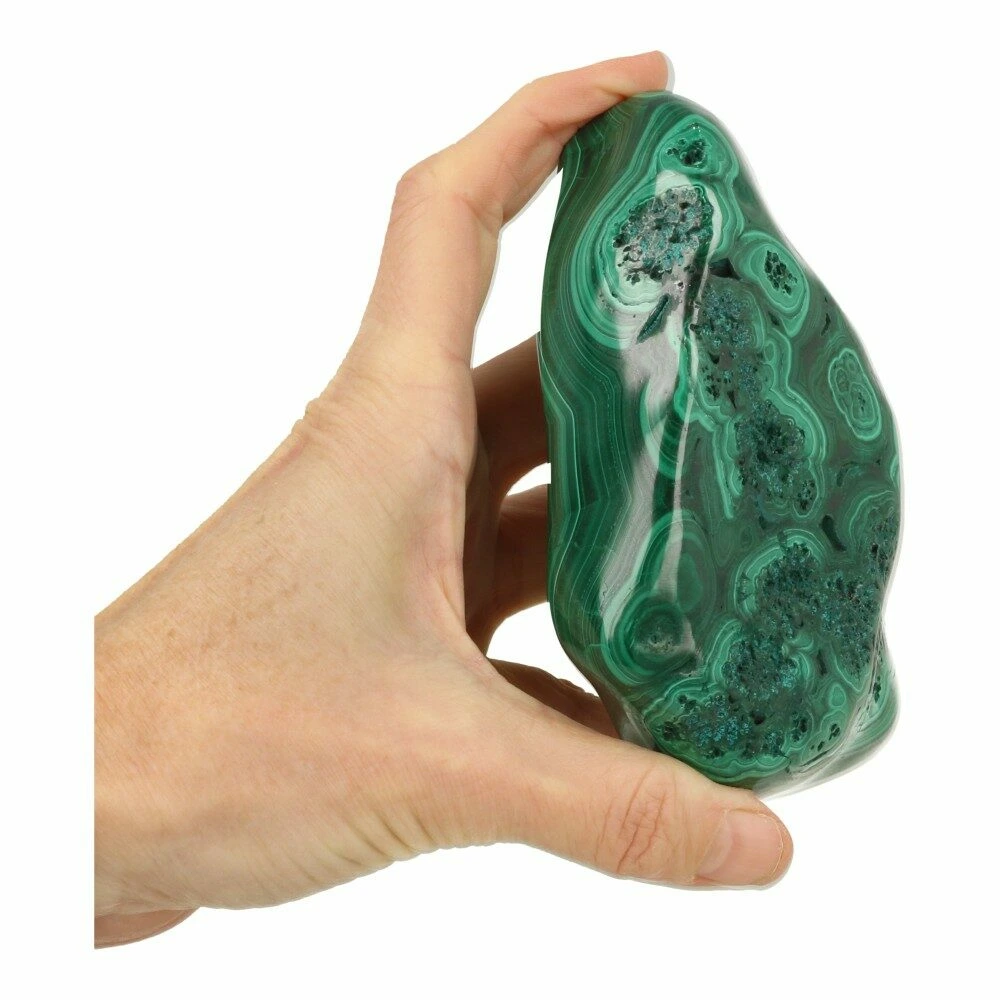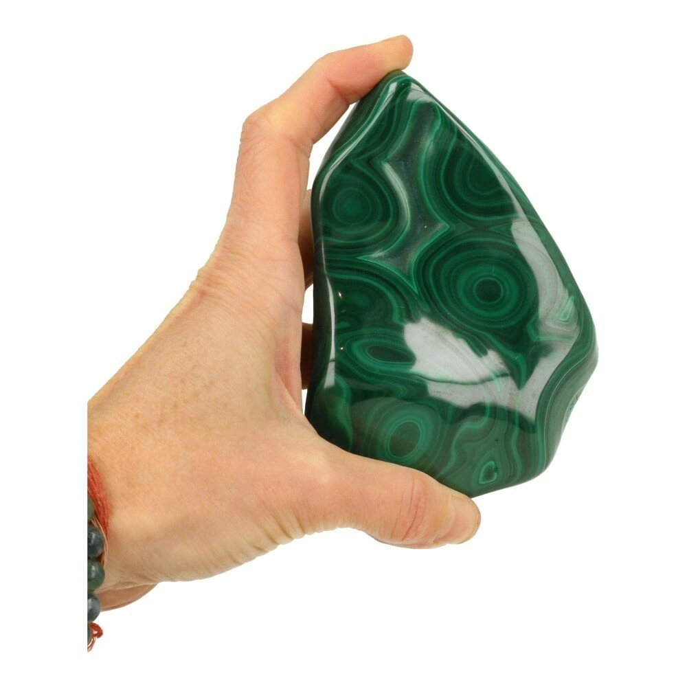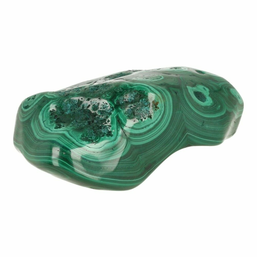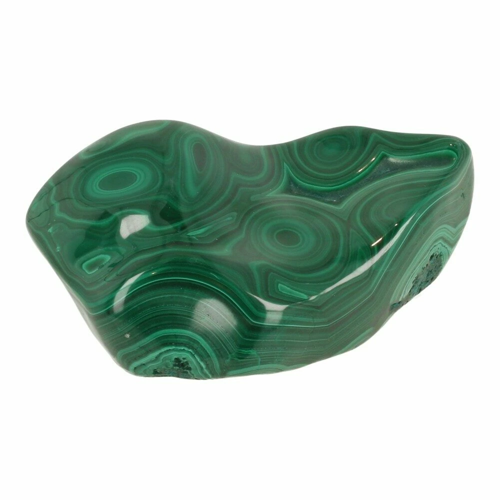 Prachtige diepgroene malachiet gepolijst uit Democratische Republiek Congo. Dit stuk gepolijste malachiet heeft een fraaie fijne tekening aan beide zijdes. Doordat de bolle groeivorm is gepolijst zijn de fraaie ronde lijnpatronen goed zichtbaar, en op de smalle zijde de laagjes waaruit de malachiet is opgebouwd. Dit stuk heeft een bijzondere intense kleur groen en is mooi rond gepolijst aan de randen, met 2 volledige verschillende tekeningen aan beide zijdes. De afmeting van dit fijne stuk gepolijste malachiet is ruim 12cm lang, 8cm breed en 4cm hoog. Je ontvangt de malachiet gepolijst van de foto.