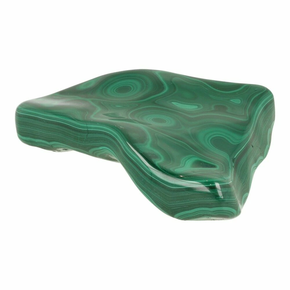 Prachtige diepgroene malachiet gepolijst uit Democratische Republiek Congo. Dit stuk gepolijste malachiet heeft een fraaie fijne tekening aan beide zijdes. Doordat de bolle groeivorm is gepolijst zijn de fraaie ronde lijnpatronen goed zichtbaar, en op de smalle zijde de laagjes waaruit de malachiet is opgebouwd. Dit stuk heeft een bijzondere donkere kleur groen en een grillige achterzijde met veel kleine natuurlijke holtes. De afmeting van dit fijne stuk malachiet is circa 13cm lang 11cm breed en 3cm hoog. Je ontvangt de malachiet gepolijst van de foto.