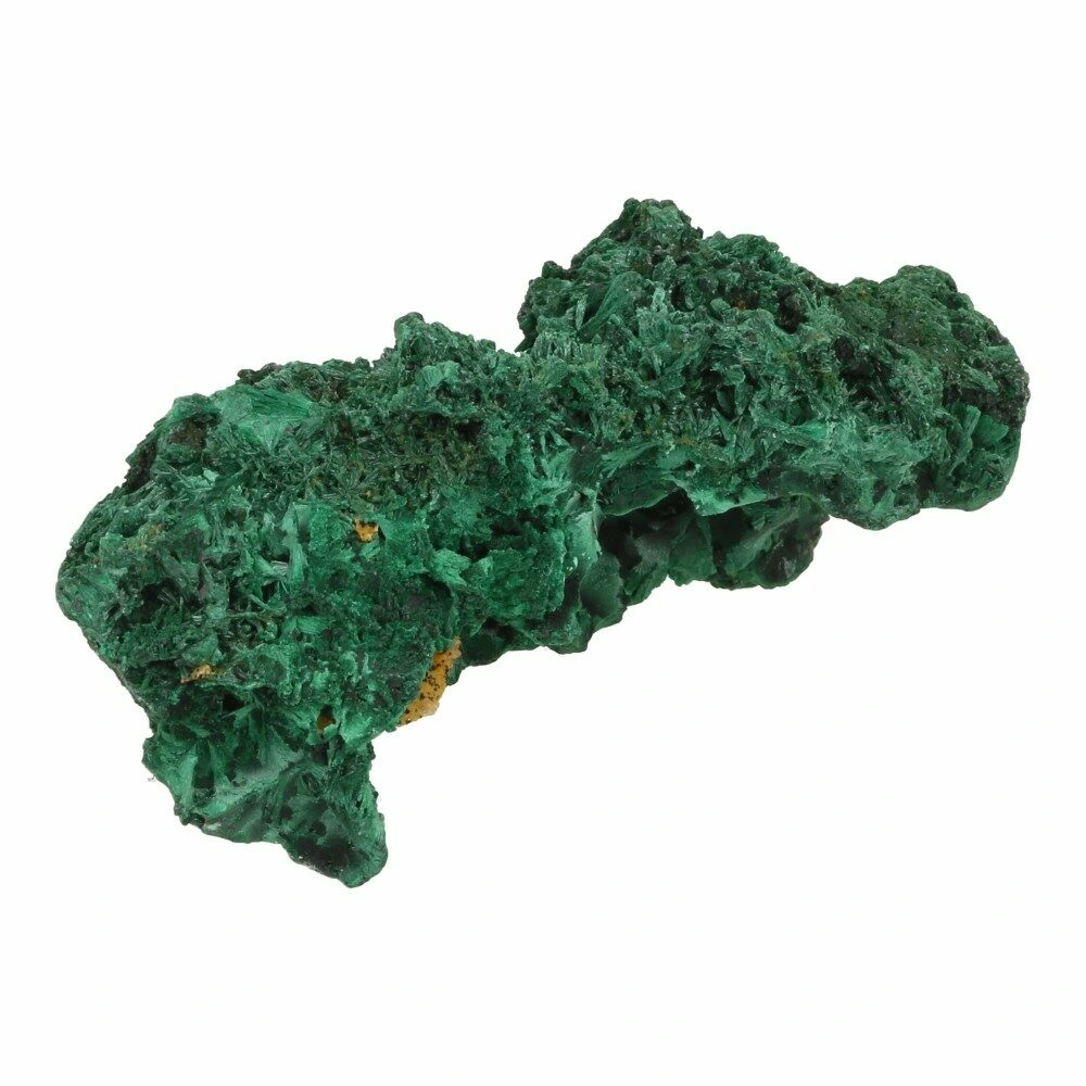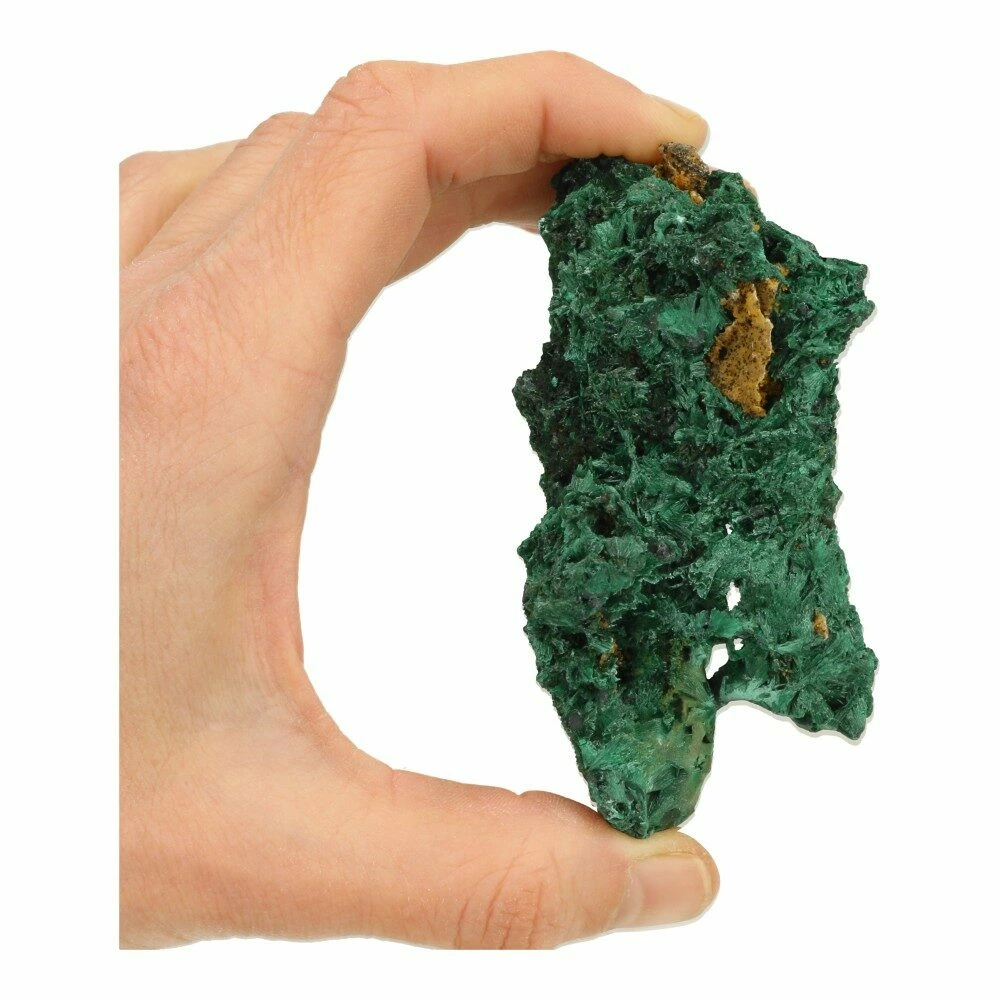 Prachtige diepgroene fluwelen malachiet ruw ‘nr3’ uit Democratische Republiek Congo. We hebben een aantal van deze unieke stukken fluwelen malachiet kunnen bemachtigen met heldergroene malachiet naaldjes op bruin moedergesteente. De schittering van de naaldjes varieert met de lichtinval. Dit stuk heeft een grillige vorm waarbij het heldere groen van het malachiet fraai afsteekt tegen het bruine moedergesteente. Met een aantal holle stukken waarbij de heldergroene vezels in waaiers zijn gevormd. De afmeting van dit fraaie stuk is circa 9,5cm lang, 5cm breed en 4cm hoog. Je ontvangt het stuk fluwelen malachiet van de foto.