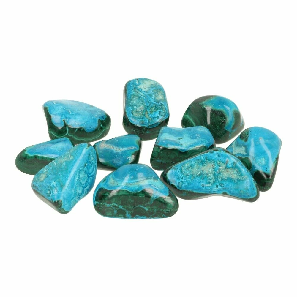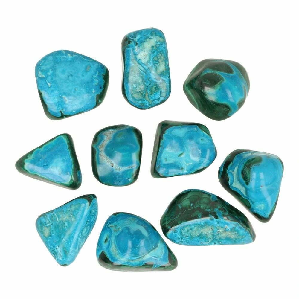 Chrysocolla komt voor in verschillende kleuren blauw, groen en bruin. Iedere steen is uniek in kleurschakering en tekening.