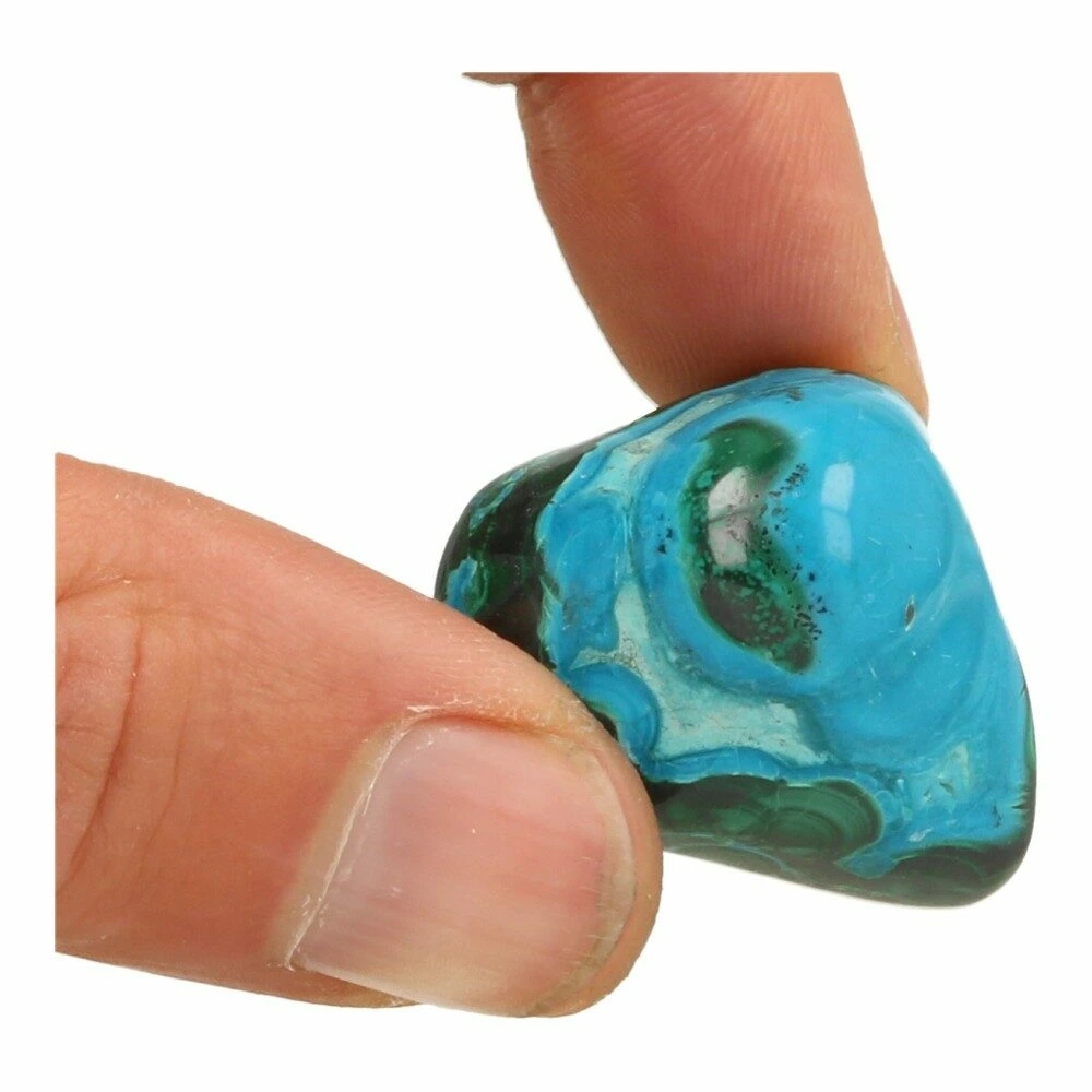 Prachtige malacolla trommelsteen met unieke tekening. Malacolla is een andere naam voor chrysocolla met malachiet Deze malacolla trommelstenen hebben een fraaie tekening en intense kleur, puur natuur! Je ontvangt een soortgelijke malacolla trommelsteen als op de foto. De afmeting is circa 3-4cm lang.