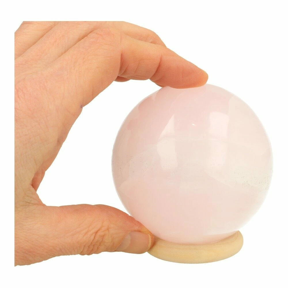 Heerlijk zachtroze mangano calciet bol met een diameter van ruim 69mm uit Pakistan. Mangano calciet wordt ook wel roze calciet of opaak genoemd. Deze mangano calciet bol is mooi lichtroze van kleur en heeft een wit lijnenspel. Je ontvangt de bol van de foto met houten ring.