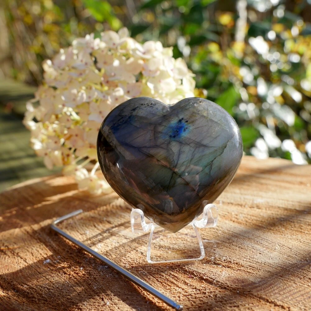 Een fraaie mini urn of assteen om een symbolische hoeveelheid as in te bewaren. De afmeting van deze labrdoriet mini urn in hartvorm is ongeveer 5cm breed en hoog en 2cm dik. Je ontvangt een soortgelijke labradoriet mini urn hart als op de foto, inclusief plexiglas standaard om het hart recht neer te kunnen zetten. Ieder labradoriet hart is van topkwaliteit met veel glans aan beide zijdes. Wat is er een mooier symbool voor de verbinding dan een labradoriet in hartvorm?