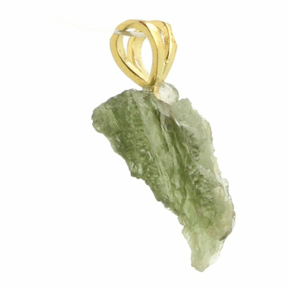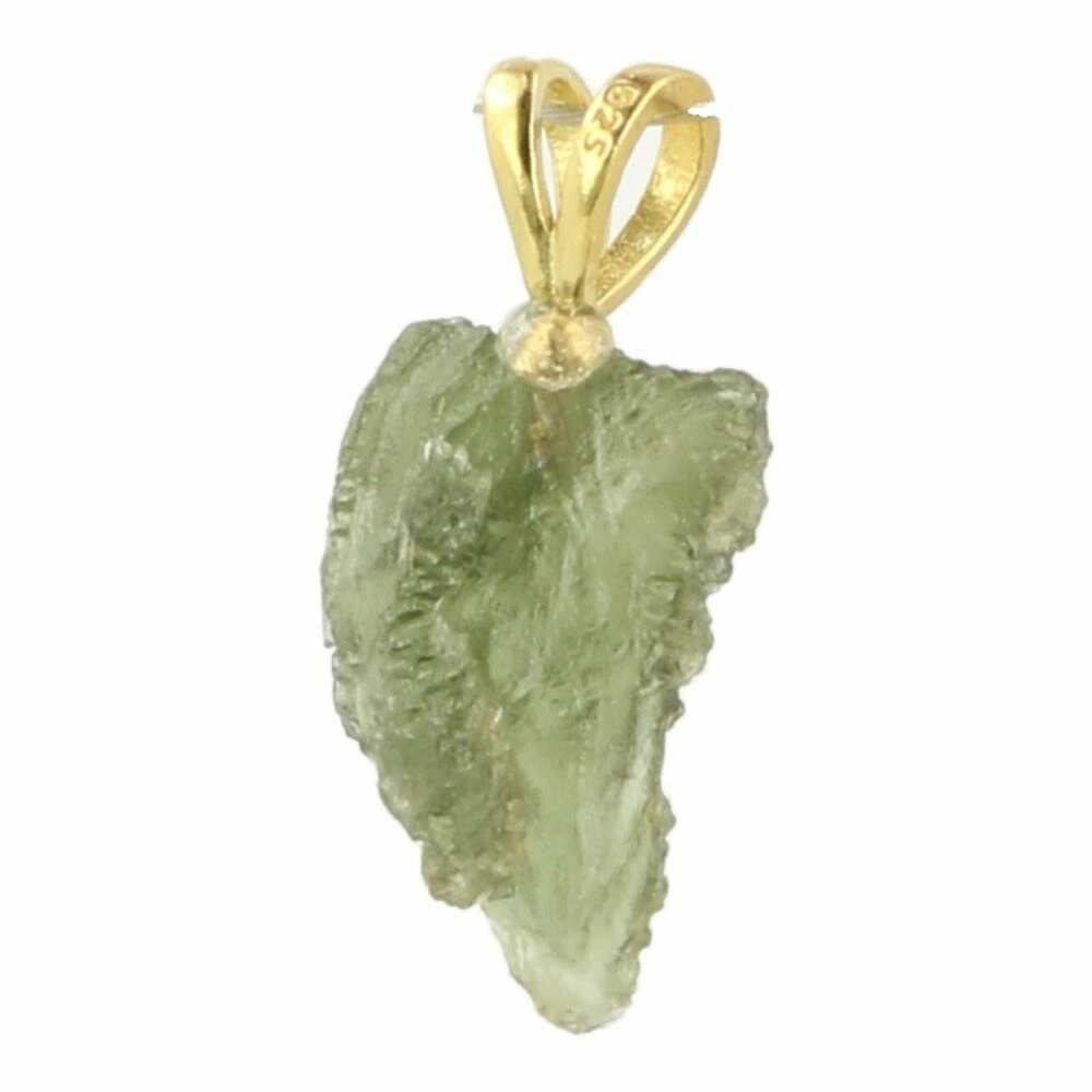 Unieke moldaviet hanger met een gouden oogje uit eigen productie. Iedere moldaviet hanger is uniek, je ontvangt de moldaviet hanger van de foto. Het oogje is gemaakt van verguld zilver, dus een dun laagje goud op 925 sterling zilver. Je kunt de moldaviet fraai dragen aan een gouden ketting. De afmeting van de moldaviet is ongeveer 16mm hoog en 12mm breed.
