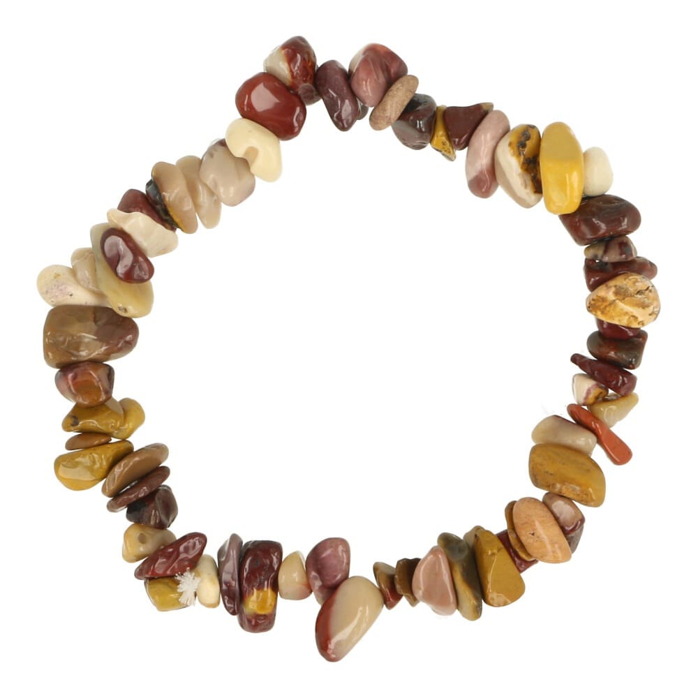 Mooie heldergekleurde mookaiet jaspis armband split uit Australië. Ieder steentje in de mookaiet jaspis armband is anders van kleur en tekening, hele mooie armbanden. Je ontvangt een soortgelijke mookaiet jaspis armband split als op de foto. De lente is circa 18cm, geregen op rekbaar koord.