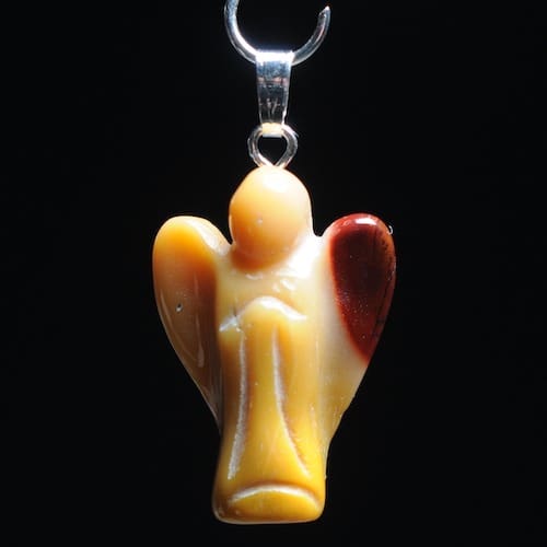 Mooie heldergekleurde mookaiet jaspis hanger engeltje. De mookaiet jaspis hanger engeltje wordt geleverd zonder touwtje of leertje. Deze hanger kan ook mooi als sieraad gedragen worden aan een zilveren ketting. Ieder hanger is werkelijk uniek in tekening en kleur. Je ontvangt een soortgelijke hanger als op de foto. De hoogte van het engeltje is ongeveer 25mm.